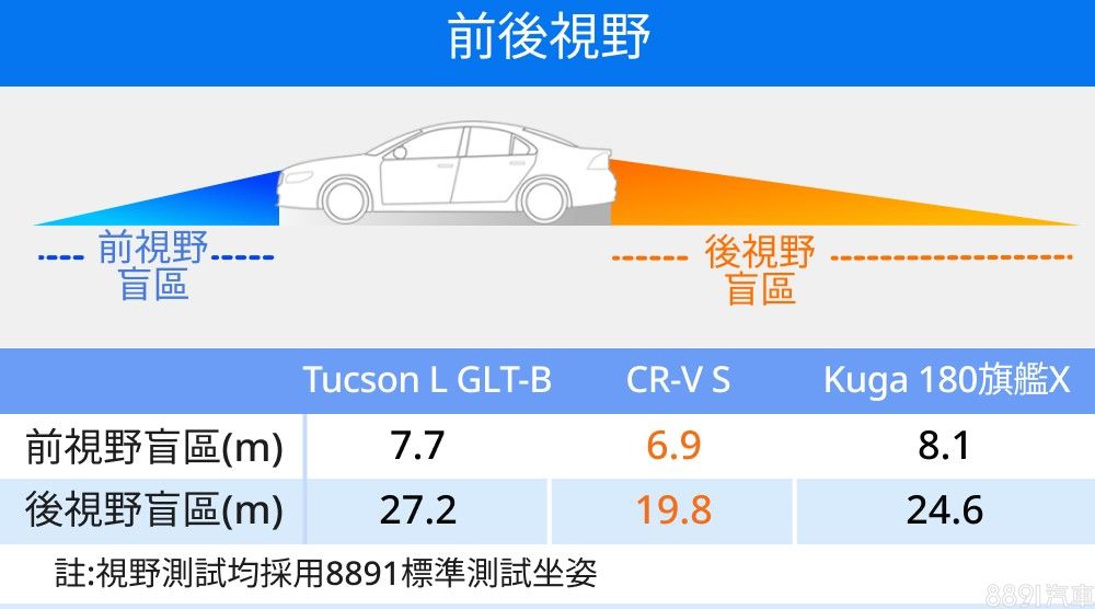 CR-V在前後視野項目表現出色,對比兩位對手在前方視野以微幅差距勝出,後方則受惠於方正的車尾線條,後方死角不到20m,比起流線外型的Tuscon L、Kuga要來的短上許多。