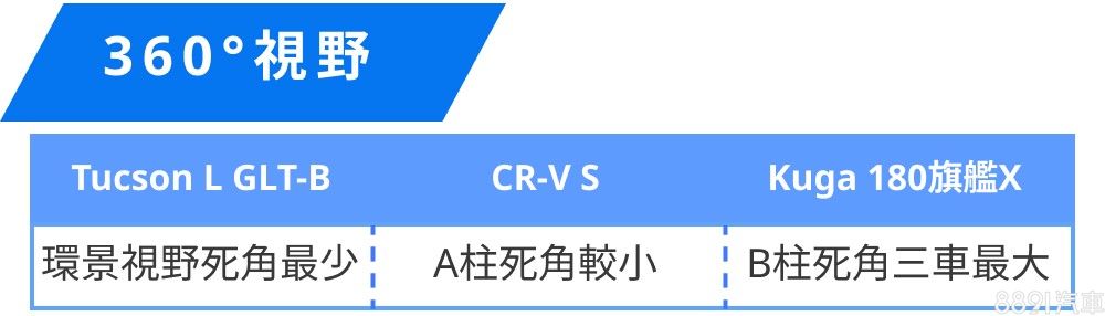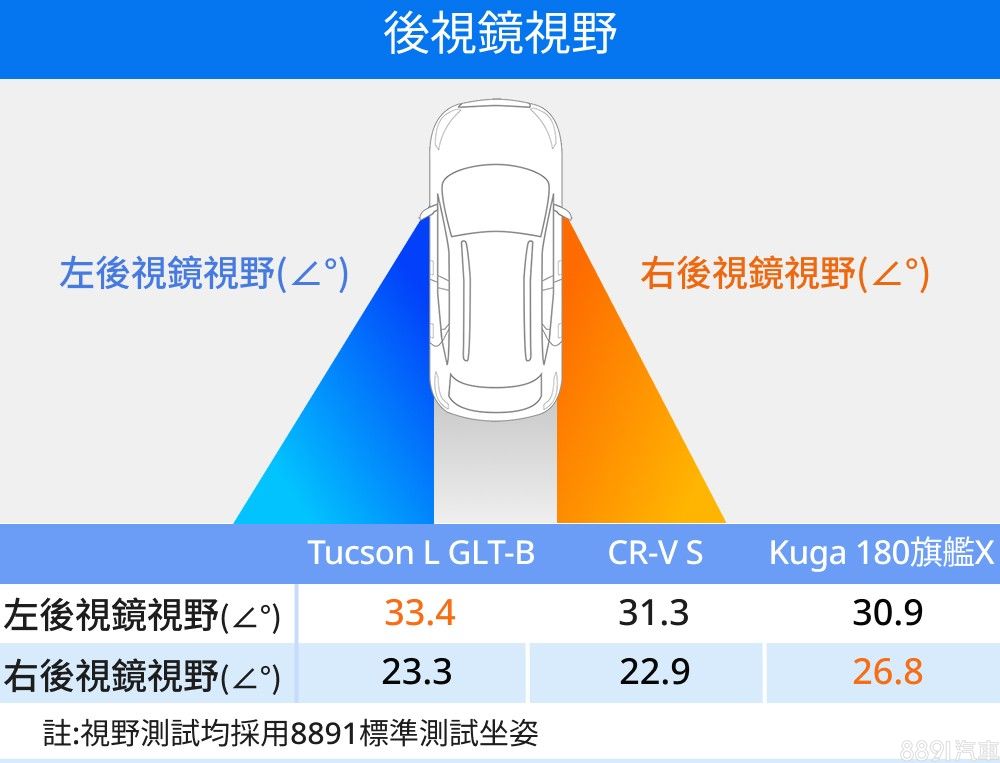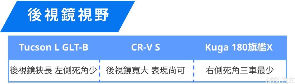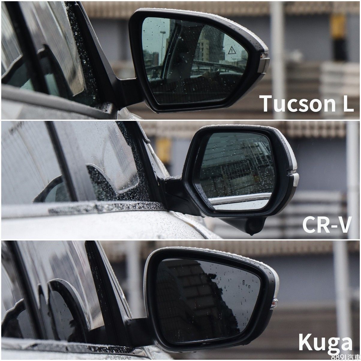 後視鏡視野方面,Tucson L與Kuga分別在左、右兩側擁有較佳的照射範圍,CR-V以些微差距落後對手,主要是因為CR-V後視鏡鏡片造型較為方正,雖然有利於車身、地面的掌握度,但卻不利於照射廣度。此外Tucson L與Kuga都配有盲點偵測系統,CR-V卻僅在右側採用影像輔助,便利性與辨識度都不如對手直覺好用。