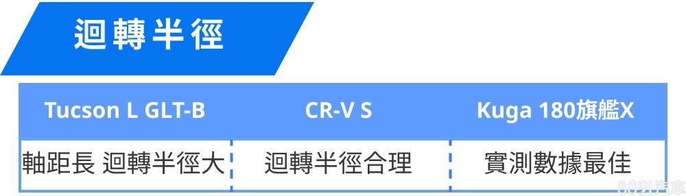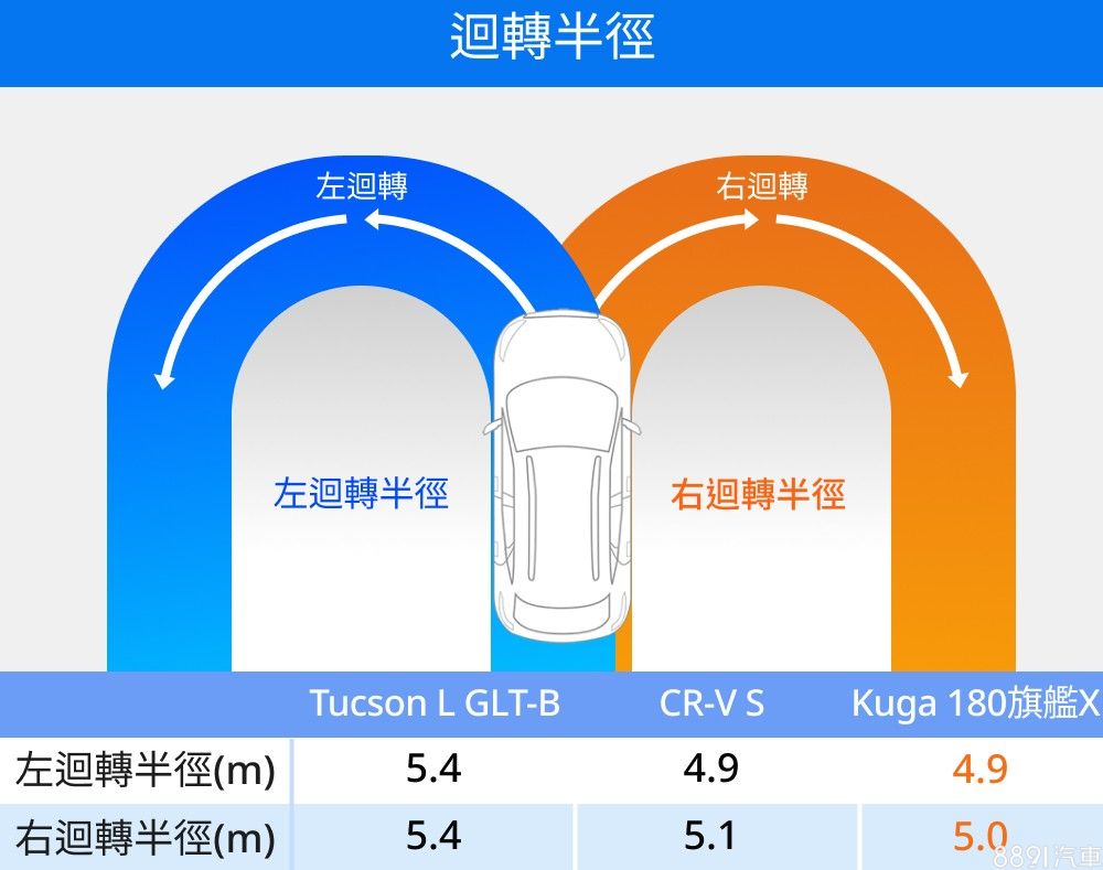 三車同樣都是中型SUV級距,也都沒有後輪轉向等「高科技」輔助,那麼軸距同級之最、長達2755mm的Tucson L自然而然也就測出5.4m的迴轉半徑。CR-V與Kuga則測出約5m左右迴轉半徑,在中型SUV級距中屬合理表現。