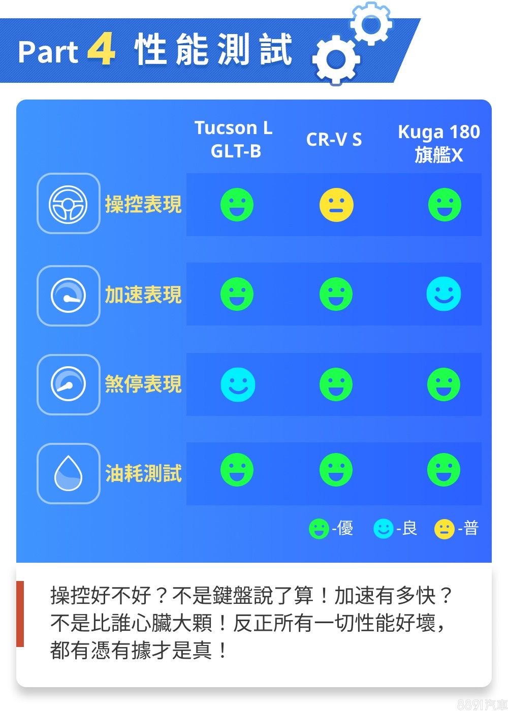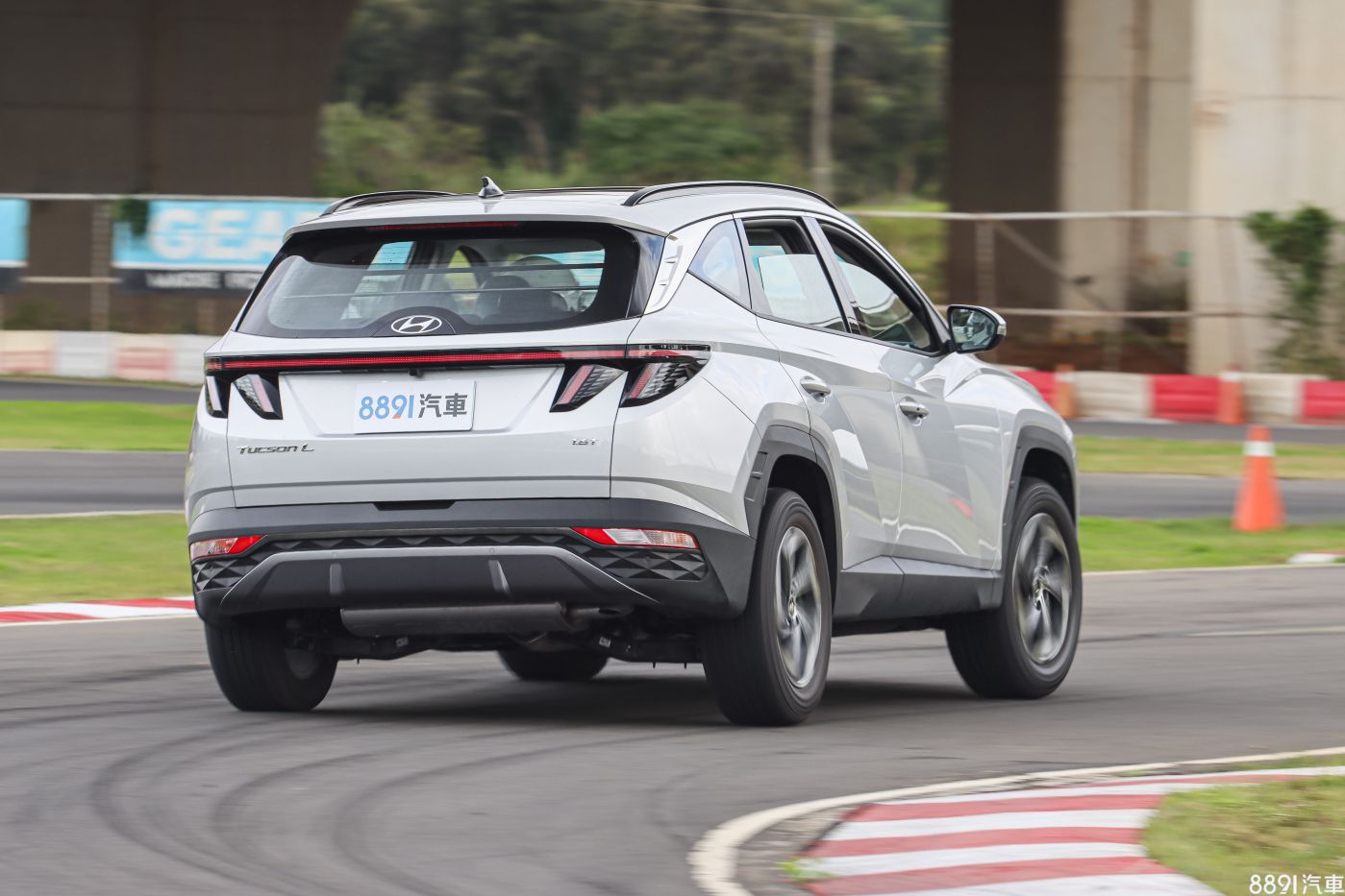三輛車懸吊結構都是前麥花臣、後多連桿設計,也均為前驅設定,甚至輪胎規格配置也差異不大,不過Tucson L軸距最長,跟最短的CR-V相比,多了95mm,也較Kuga長了45mm,這個L加長設計可說是相當徹底!永安卡丁車場地方小、彎窄,尺碼愈小的車愈吃香,也就是說,Tucson L拉長軸距後,理論上將輸在起跑線上!但完成三車單圈測試後發現,Tucson L整體靈活度、受控性,都與對手無異,車頭指向性也比CR-V明確,而也許因為底盤設定理想,讓輪胎可以緊貼路面,實際發揮出的抓地力比預期好一點,有助於展現速度!