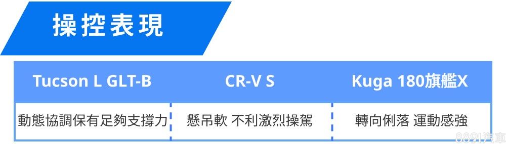 三車有志一同都採用小排氣量渦輪引擎,平原式扭力峰值的輸出特性相當適合台灣多山的使用環境,排氣量也都落在1.8L稅金級距以下,年繳稅金11920元,算是會跑又相對省錢的動力配置。Tucson具備180hp/27kgm輸出,搭配傳輸效率較高的雙離合器變速箱,動力感受直接換檔迅速,CR-V則具備193hp/24.3kgm,提供三車之中最大的馬力,搭配CVT變速箱,Kuga輸出則是180hp/26.3kgm,輸出水準與Tucson相近,卻匹配不具備手動換檔功能的8速自排變速箱。
