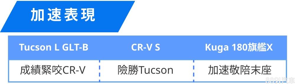 分析實測數據,CR-V靠著較好的起步推力拔得頭籌,較大的馬力也在測試過程中率先完成零百加速,實測8.34秒的成績相當出色。Tucson則在零四測試中繳出與CR-V極為接近的成績,較高的通過末速頗有後來居上的趨勢,此外雙離合器換檔迅速的優勢也反應在40~70km/h加速上,再加速反應為三車之最。