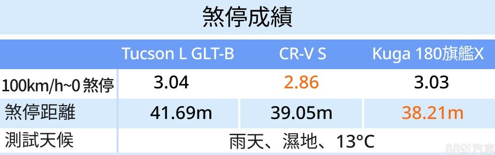 煞停測試當下為雨天,柏油路面也為全濕的狀態,相當考驗各車配胎面對濕地的縱向抓地能力,Kuga實測煞停距離最短、甚至與過去乾地測試結果相差無幾,在制動性能方面擁有不分乾濕地的全天候表現。Tucson在煞車重踩瞬間明顯感受到配胎與ABS系統正努力尋找抓地力,最終煞停距離稍稍突破41m,為三車距離最長,好在制動過程沒有任何偏滑、不穩定的感受,相信主要還是受限於配胎濕地性能表現略遜對手一些。