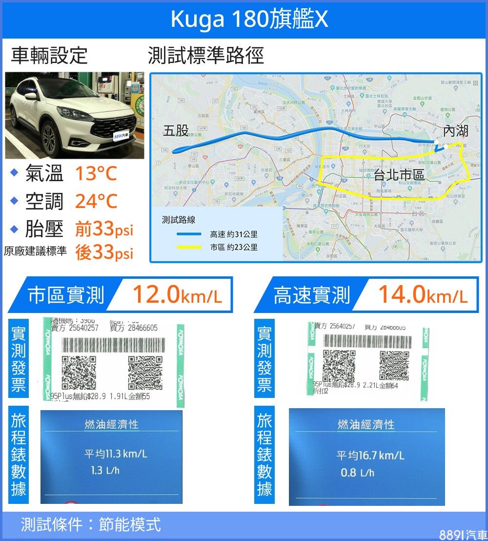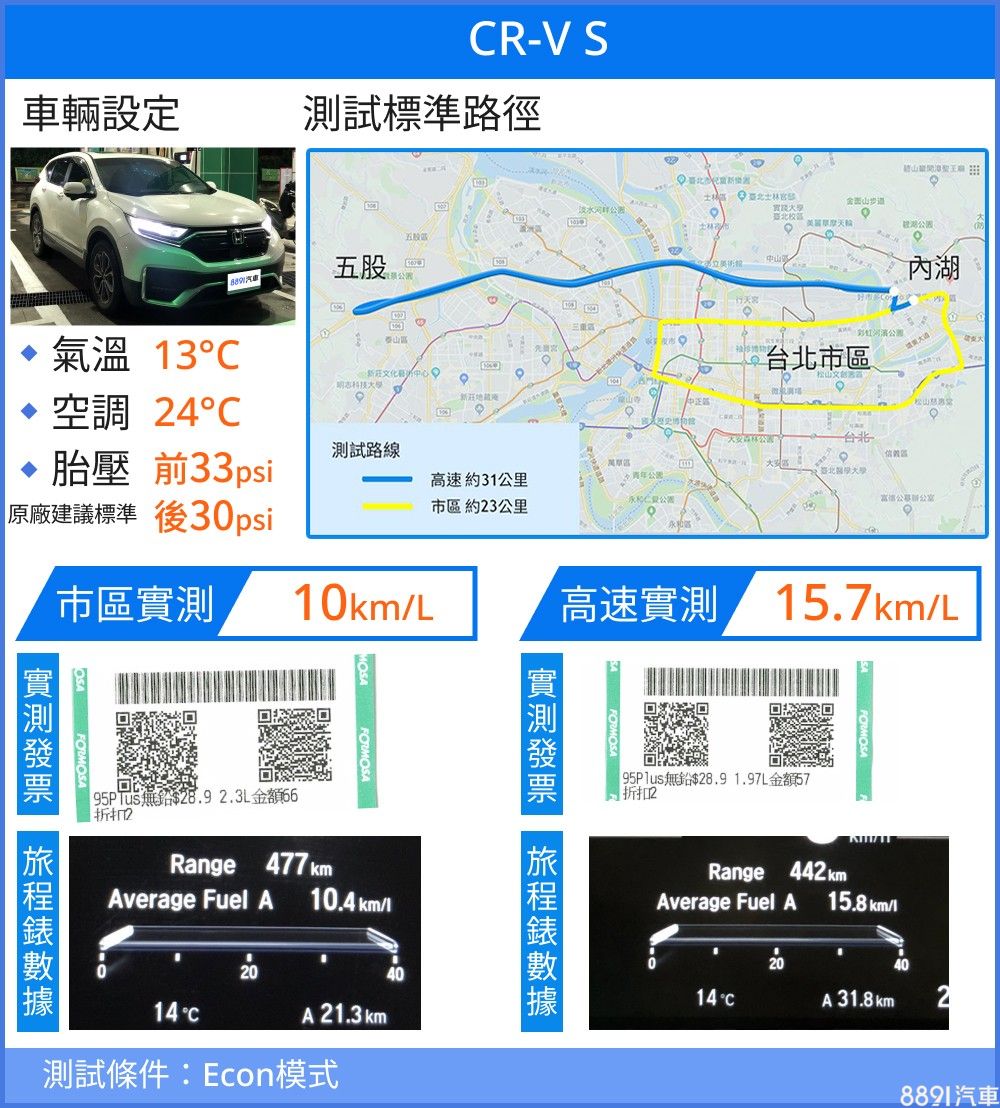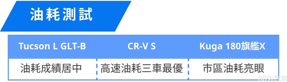 油耗測試路況相當順暢,市區、高速路段幾乎都能以最高速限行駛,三車也都具備節能模式,較為和緩的油門反應不僅利於節能表現,也能有效減少加減速所帶來的頓挫感。市區油耗以Kuga最為出色,在三車怠速熄火均能正常作動的前提下,Kuga唯一的優勢便在汽缸休止科技,在低負載、滑行時關閉中央第二缸,減少燃油消耗。高速路段則是CR-V油耗最佳,CVT變速箱能大大降低高速巡航轉速,有利於節省燃油。