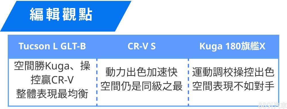 從實測結果看來,Tucson L似乎沒有太過於突出的地方,測試項目中勝出的僅有環車視野、隔音表現,但細看會發現其實數據都位居中間的位置,結合了兩個對手的優點加以整合,並加強了對手們不足之處,有CR-V缺少的操駕協調性、也有Kuga較不擅長的空間舒適度,整體表現非常均衡,還有新世代大改款所帶來的「新鮮感」也是對手們沒有的,想要在競爭激烈的百萬中型休旅市場佔得一席之地,Tucson L絕對有本錢。
