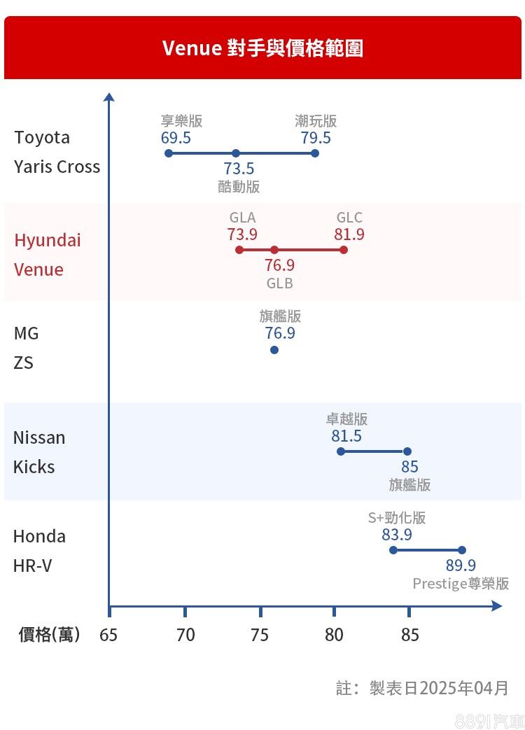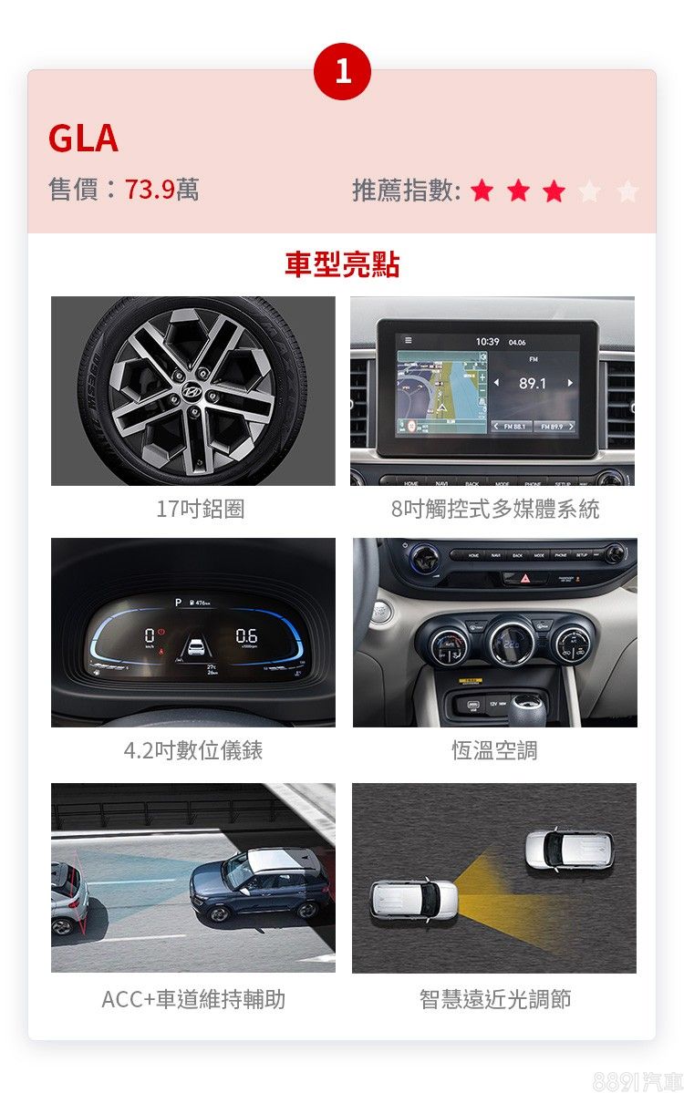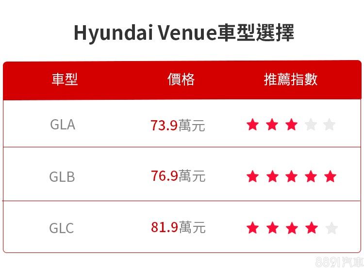 Venue共有GLA、GLB與GLC三款車型,建議售價分別為73.9萬、76.9萬與81.9萬。雖然Venue在入門GLA就搭載了Level 2、數位儀錶等重點配備,但多3萬升級GLB,除了配備到位,也多出琺瑯白雙色內裝,視覺感一併升級,不用攻頂,你就能享有最潮的都會代步小車。