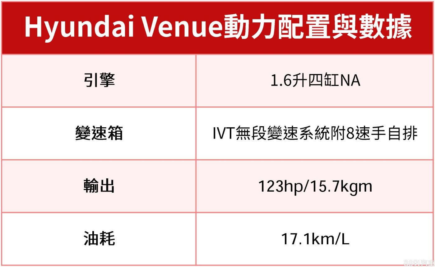 Venue全車系搭載Smartstream 1.6升自然進氣引擎,配CVT變速箱,輸出123hp/15.7kgm,行路感受偏向輕快取向。雖無強勁加速感,但應對市區代步與偶爾載人旅行皆不成問題。