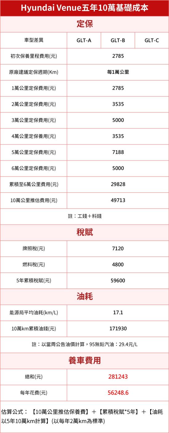 國產小休旅保養費平易近人,以每一萬公里保養週期來看,每次進場大概花費2000~4000元即可,即使是5萬公里多出CVT變速箱油更換,也才7188元。官方能源局平均油耗為17.1 km/L,在小型SUV中屬中上水準,假設每年行駛2萬公里、油價為29.4元/L,五年累積油資為171930元,佔整體支出比例接近六成,是Venue養車成本中最大的支出項目。