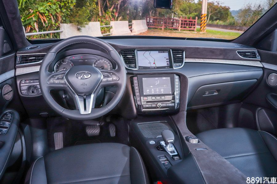一改舊世代老氣木紋內裝,全新QX50導入InTouch雙螢幕介面,上方八吋螢幕顯示導航、AVM環景影像等與駕駛息息相關的資訊,下方七吋螢幕則提供音響、冷氣、導航輸入、車輛設定等操作介面,更利用中控台線條區隔駕駛座艙,置身其中頗有操之在我的滿足感。