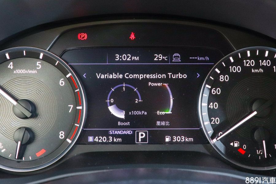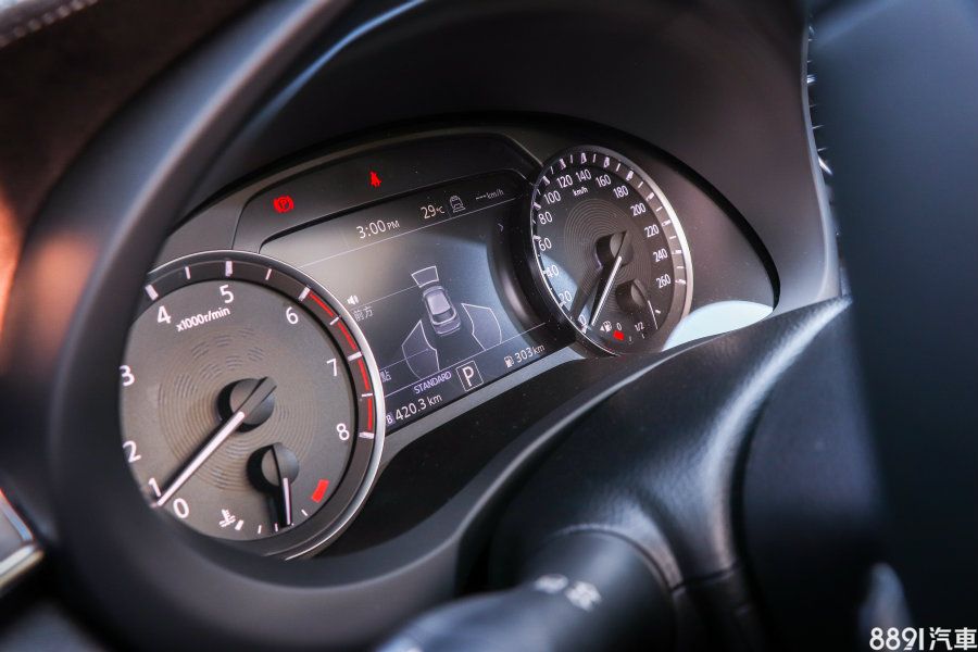 雙環儀表保留傳統指針介面,中央LCD螢幕可顯示智慧駕駛輔助狀態、車速、行車電腦等資訊。創新的可變壓縮比引擎也能在此獲取引擎狀態,對於日常駕駛卻是沒有太大意義,單純技術展現。