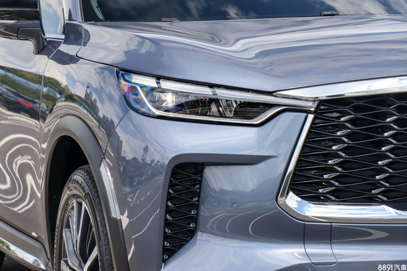 新世代頭燈造型修飾得更細長,輪廓並與水箱罩相連接,頭燈上緣為整合方向燈和日行燈的導光條,搭配斷點的虛線造型,成為新QX60的識別亮點。
