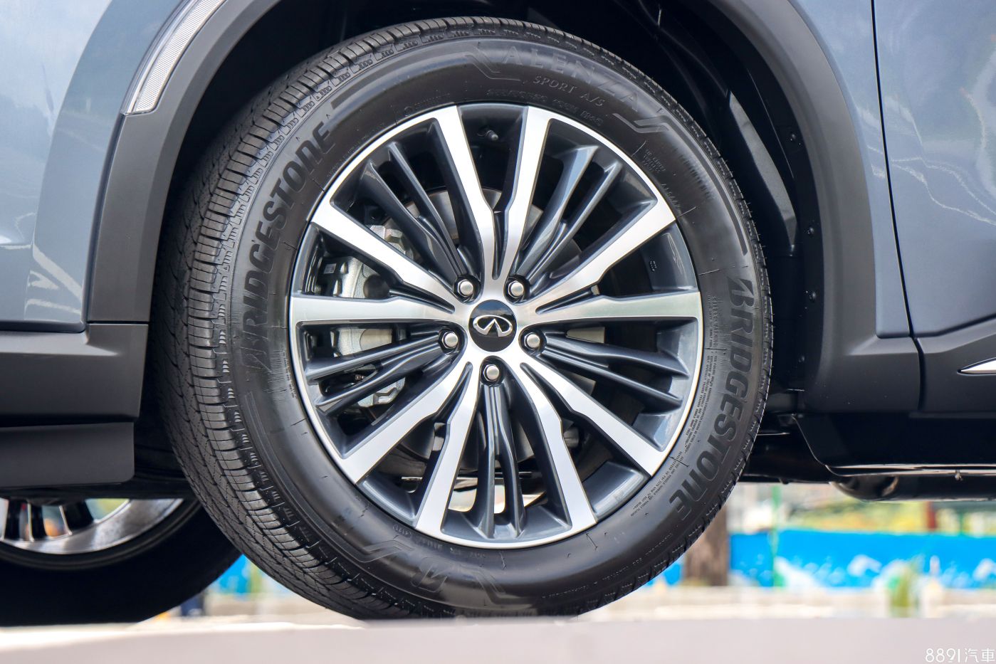 大改款QX60標配20吋鋁圈,造型則視車型有別,試駕的旗艦款配備雙色鋁圈,並搭配225/50R20的普利司通Alenza Sport四季胎,是針對休旅車款設計的胎款,以日常用車的舒適性為主,不過胎紋設計上仍可應付淺泥和小雪等非柏油路況。