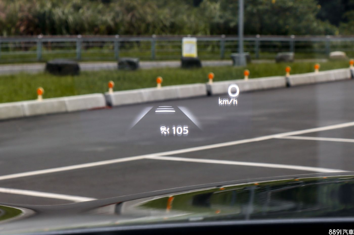 HUD抬頭顯示器為頂規專屬,畫面由駕駛前方的10.8吋投影幕投射,可顯示車速、播放音源、ACC車速及車距設定和原廠導航指示等資訊。