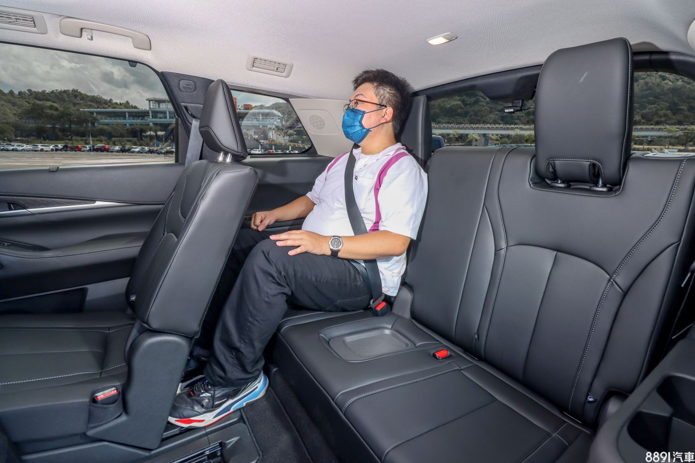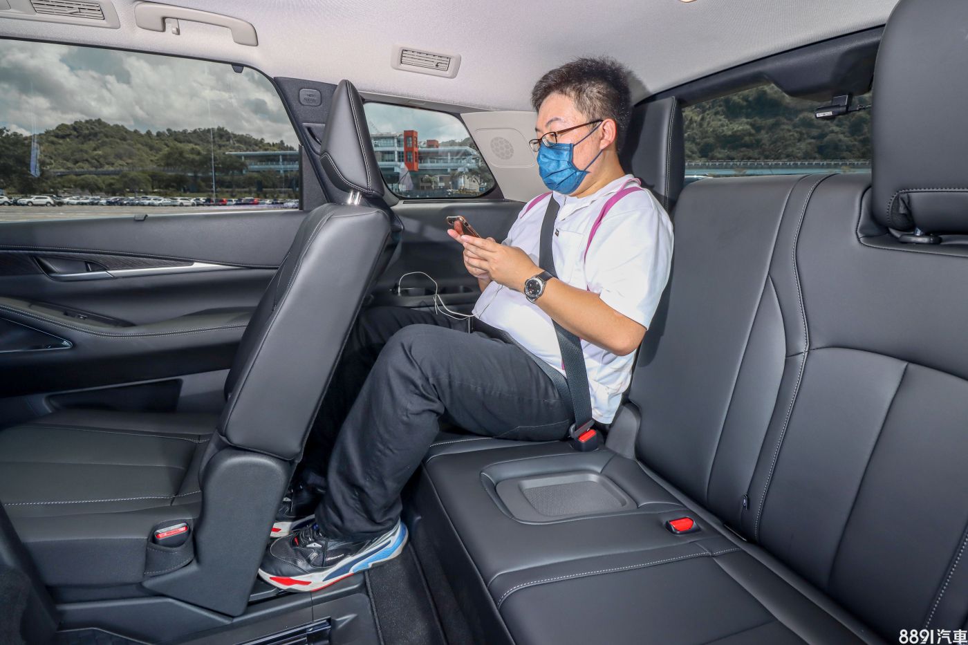 相較於前兩排,第三排椅面設計明顯平板些,椅面坐感也偏硬;而多虧第二排縱向空間充足,座椅稍稍向前滑移,就能為第三排留下適切的膝部空間。但頭部空間就僅勉強可接受,我也認為若全景天窗能延伸至第三排,應有助於降低車頂的壓迫感。