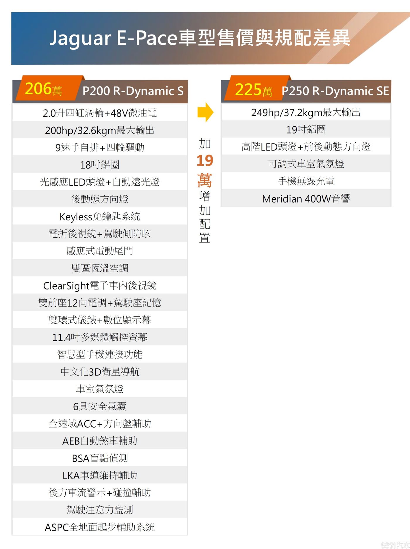 小改款E-Pace維持單一2.0升渦輪動力,甫以新導入的48V微油電系統,車型縮編至兩個等級,但入手價也突破200萬大關,入門的P200車型基礎配備、安全科技已屬完善,此次試駕的版本P250,除了輸出明顯升及、鋁圈規格更大外,還追加高階LED頭燈、手機無線充電、Meridian音響等實用配備,若沒有太大預算考量,強烈建議補齊19萬價差,直上頂規!