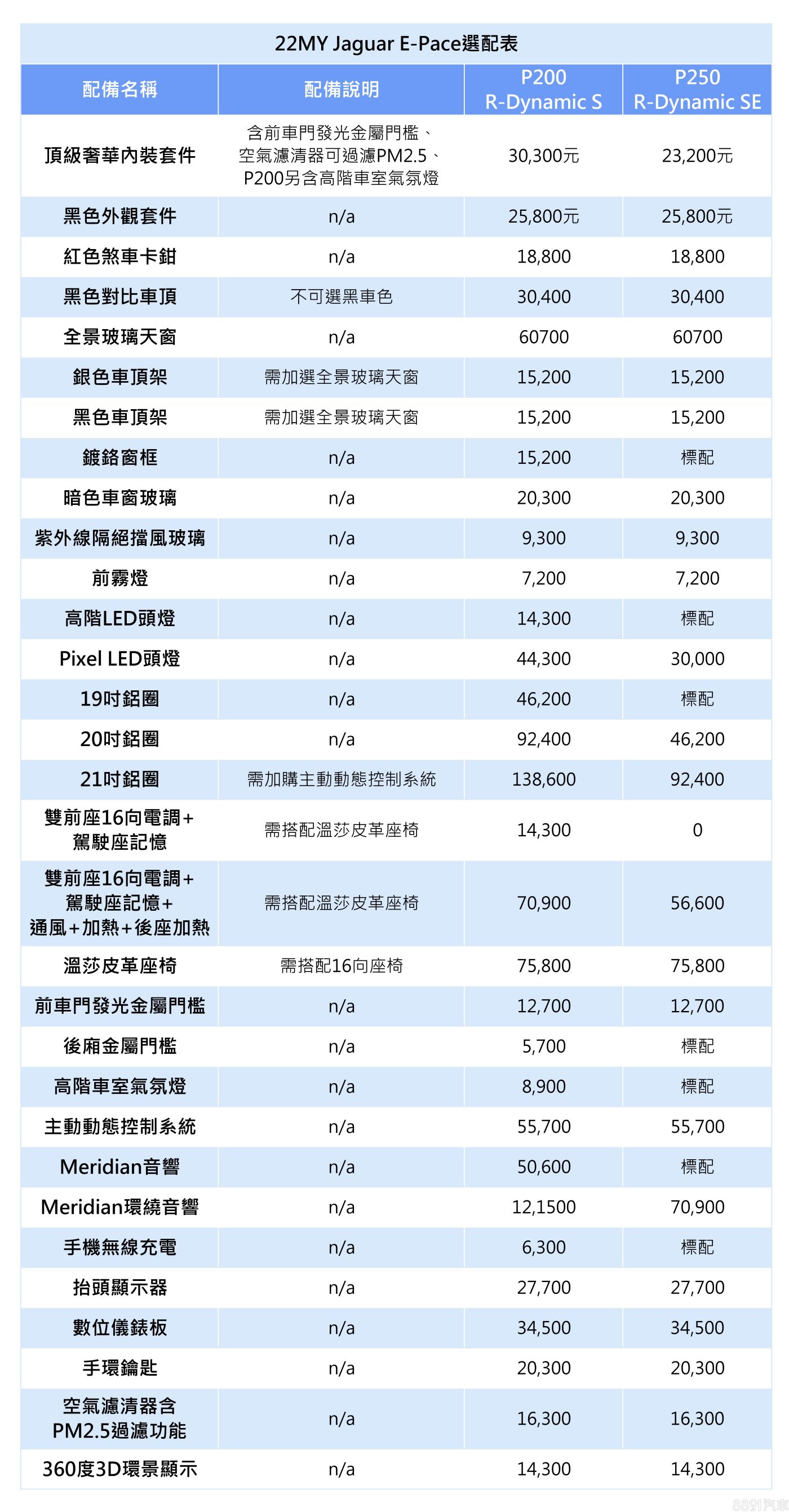 E-Pace選配項目算是豐富,要帥氣動感,有黑色外觀套件、紅色煞車卡鉗、21吋鋁圈可選;要舒適豪華,也供全景玻璃天窗、溫莎皮革座椅、Merdian音響等加值享受。不過據原廠表示,22年式E-Pace受到「全球晶片短缺」影響,包含頂級奢華內裝套件、抬頭顯示器、數位儀表板、車室空氣濾清系統、360度3D環景等選配項目,暫不提供選配,其中不乏許多重點實用配備,讓人感到有些可惜。