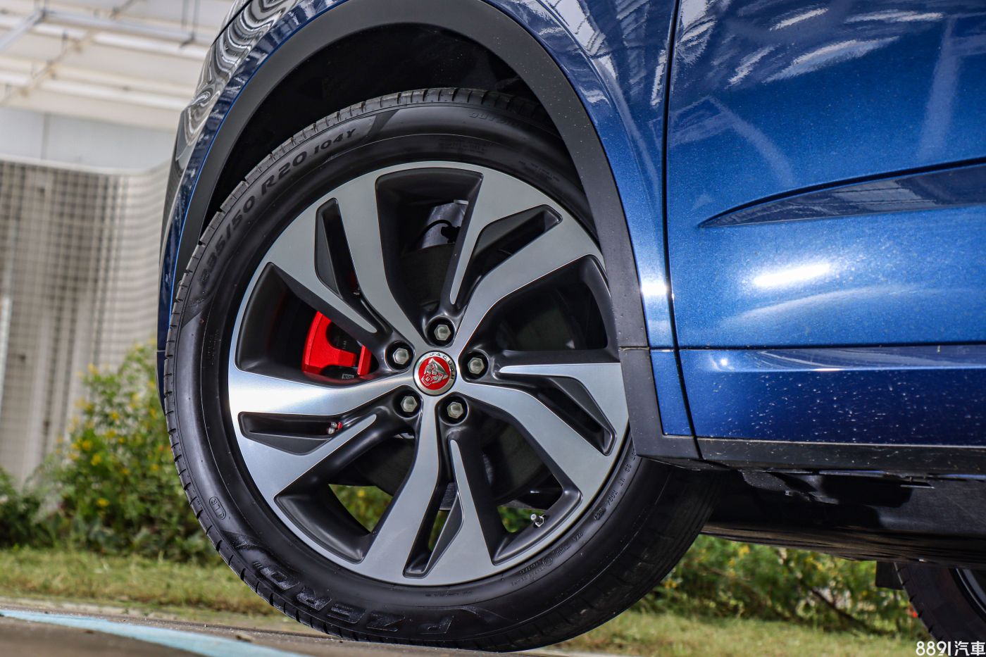 P250車型標配19吋鋁圈,試駕車另選配20吋款式,採五輻雙色切削的設計相當耐看,搭配加價升級的紅色煞車卡鉗,視覺效果出眾,與之匹配的235/50R20倍耐力P Zero性能胎,對應其249hp/37.2kgm的動力相當夠用。