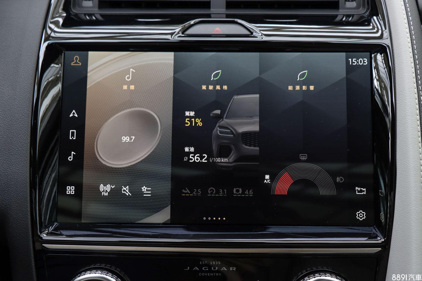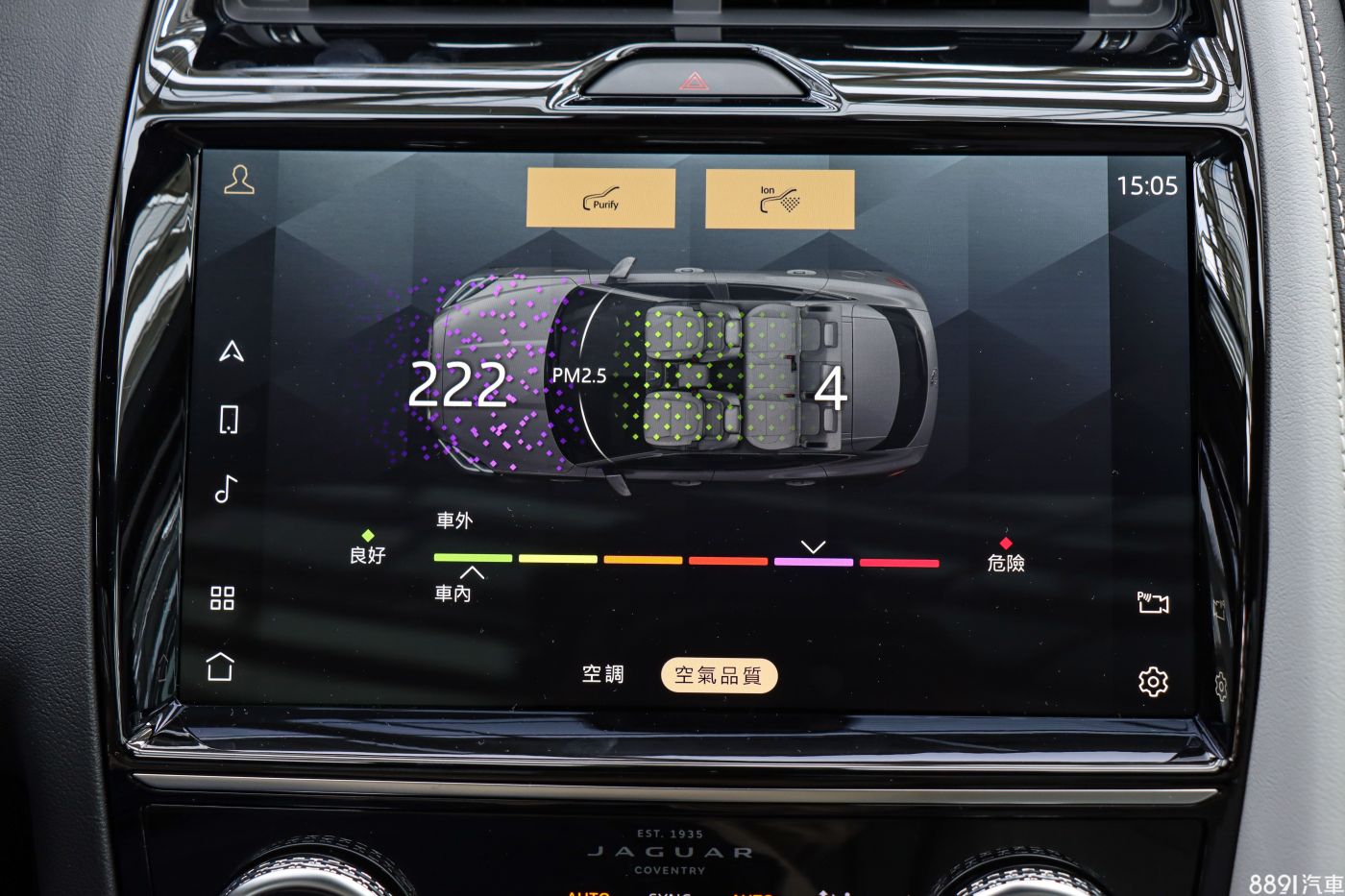 小改款E-Pace也導入「車室負離子淨化系統」的選配,原廠宣稱能有效過濾PM2.5懸浮微粒,具備「一鍵淨化」的功能,畫面上也會顯示當前車內、外的PM2.5的濃度,並用顏色等級來區分危險程度。