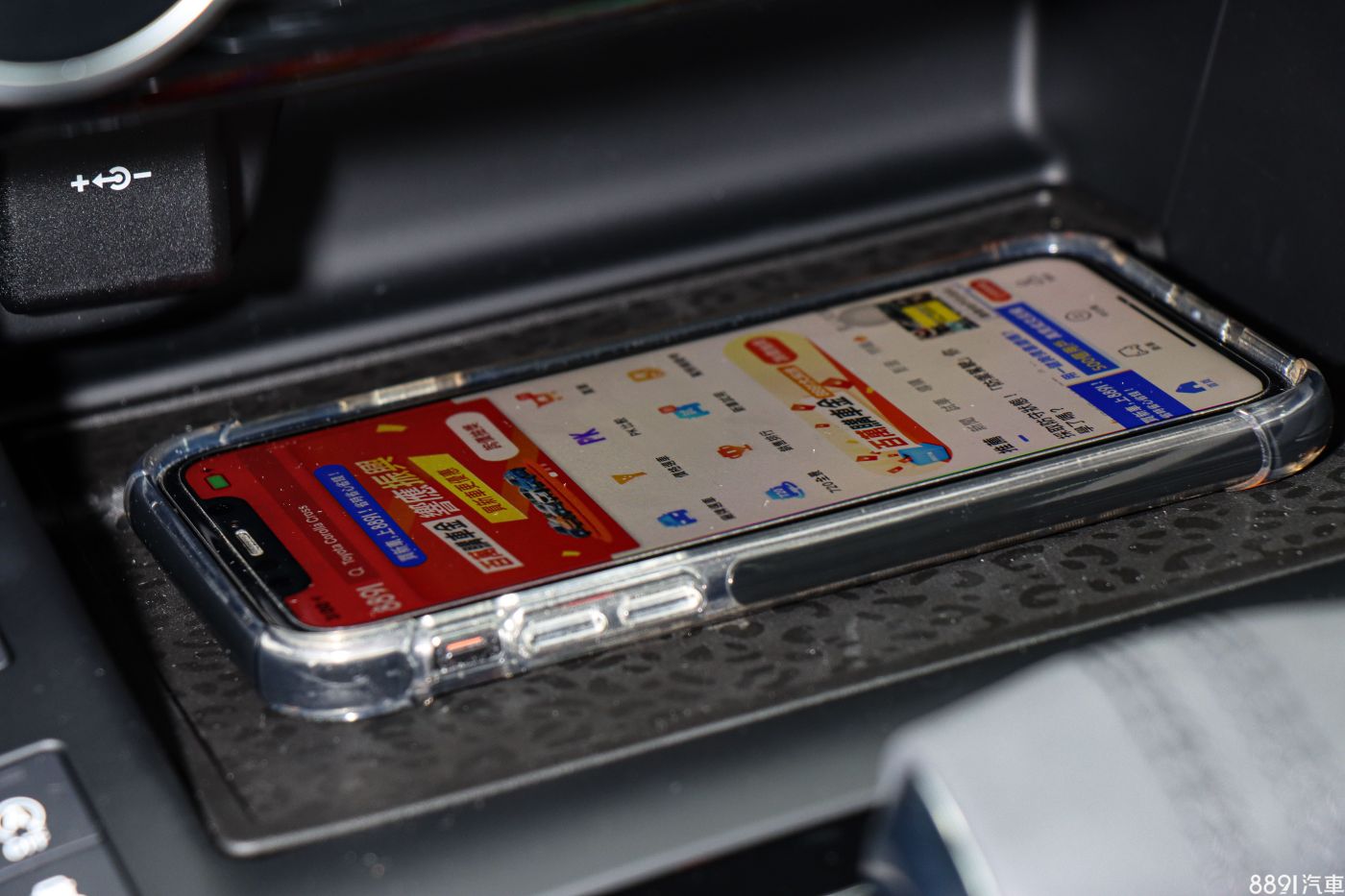 手機無線充電為P250車型標配,其位置設計在排檔座前方,以iPhone 11做示範,周圍空間仍有餘裕,即便是放入大一點的手機也沒問題,深度方面尚可,但表層有止滑設計,行車間也不致滑動,值得一提的是,上頭的壓花是參考自美洲豹的花紋,相當有趣!