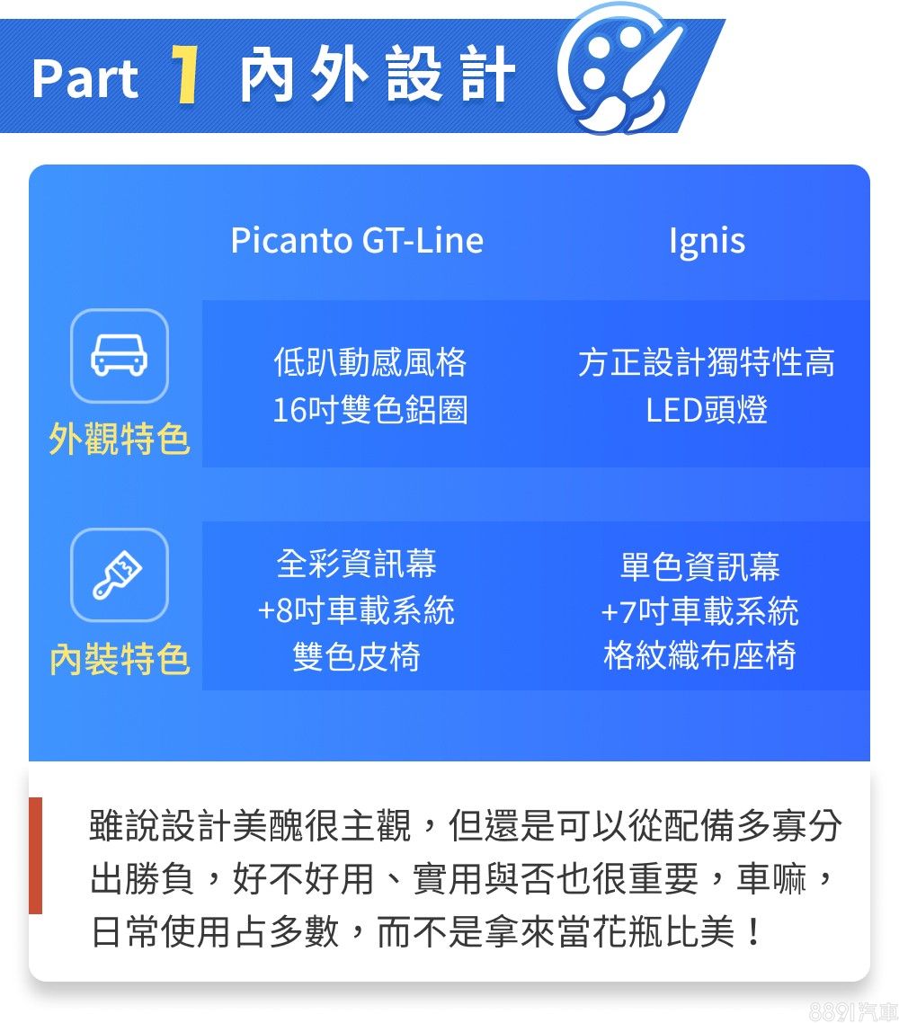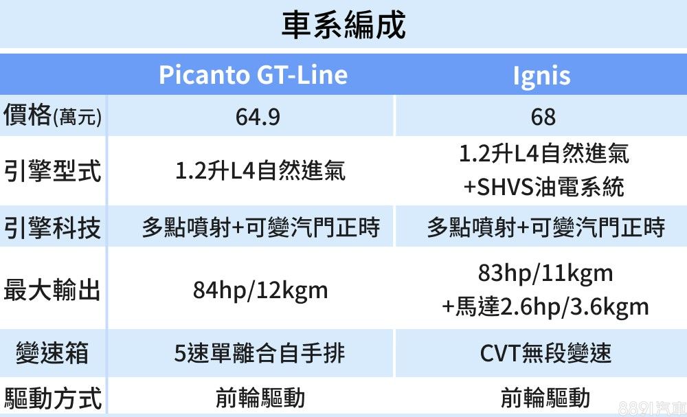 小改款Picanto共有四種版本,這次參戰是64.9萬的頂規GT-Line,對手Ignis僅提供68萬元的單一車型,價格稍高,車型選擇也不像對手豐富。動力部分,兩車的輸出數據差不多,但Picanto採用目前市面上較少見的5速單離合自手排變速箱,Ignis重點則是12V微油電系統(馬達出力2.6hp/3.6kgm),種種差異都增加動態表現的可看性!