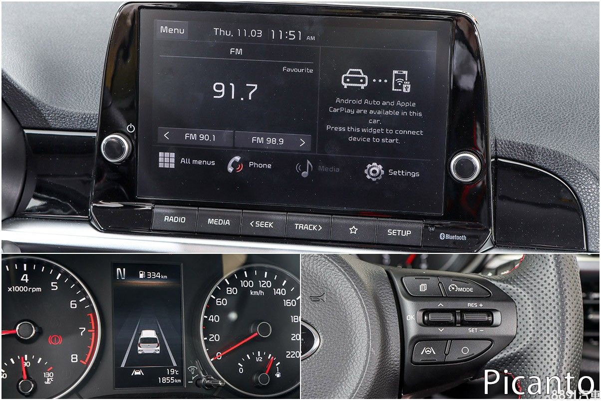 8吋多媒體主機僅提供英文介面,得稍加習慣才能用得順暢,但提供同級車中唯一的「無線」Apple CarPlay與Android Auto,一上車就連線、原本主機是否提供中文介面也就不重要了。Picanto儀錶板中央資訊幕是精美的4.2吋全彩顯示,資訊豐富度與顯示質感都勝過Ignis。方向盤按鍵除了基本定速系統,也將車道維持開關設置在此,操作頗為順手。