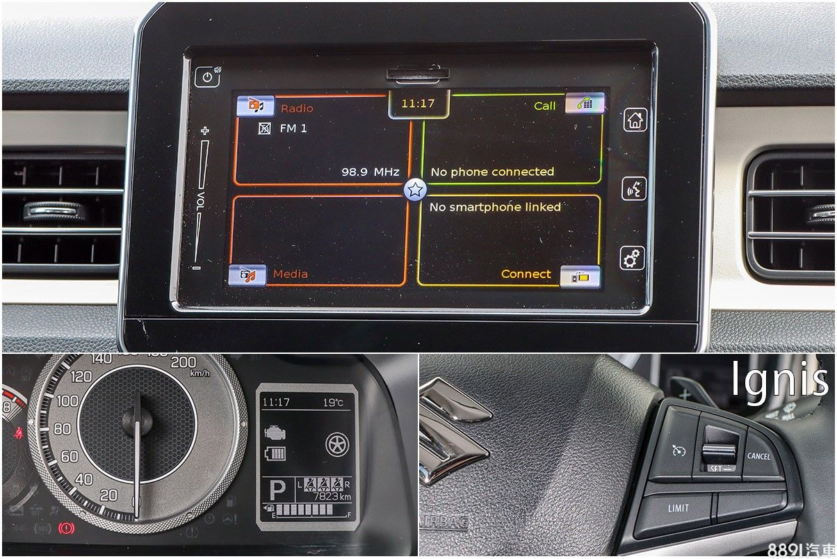 小改款Ignis將原本需2萬元選配的7吋多媒體主機列為標配,雖然為英語介面、但支援有線連接Apple CarPlay與Android Auto,使用上仍是便利。儀錶版右側提供單色液晶顯示,並提供油電系統運作狀態,不過與Picanto全彩螢幕相比,科技感遜色不少。方向盤右側則僅提供定速開關,車道偏移警示系統得從方向盤後方左側「伸手」才能關閉,便利性不如Picanto。