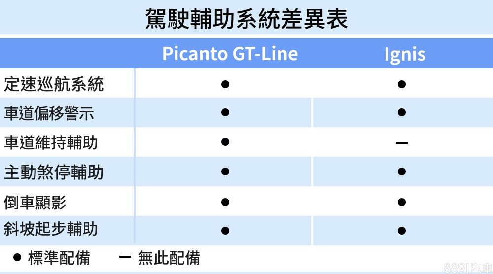 兩車在駕駛輔助方面都算跟得上時代,車道偏移輔助、主動煞停等科技都列為標準配備,但兩車都缺乏ACC主動定速,以小車級距來說倒也屬合理。不過Picanto多了主動車道維持,實測確實能將車輛維持在車道中央,大幅降低長途行車的負擔,整體規格優於Ignis。