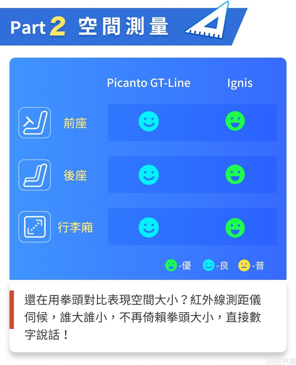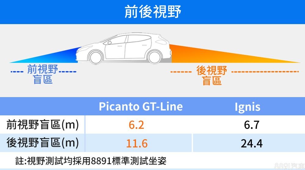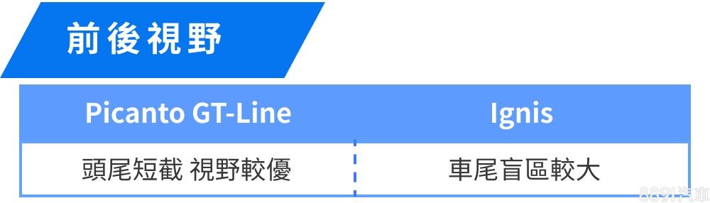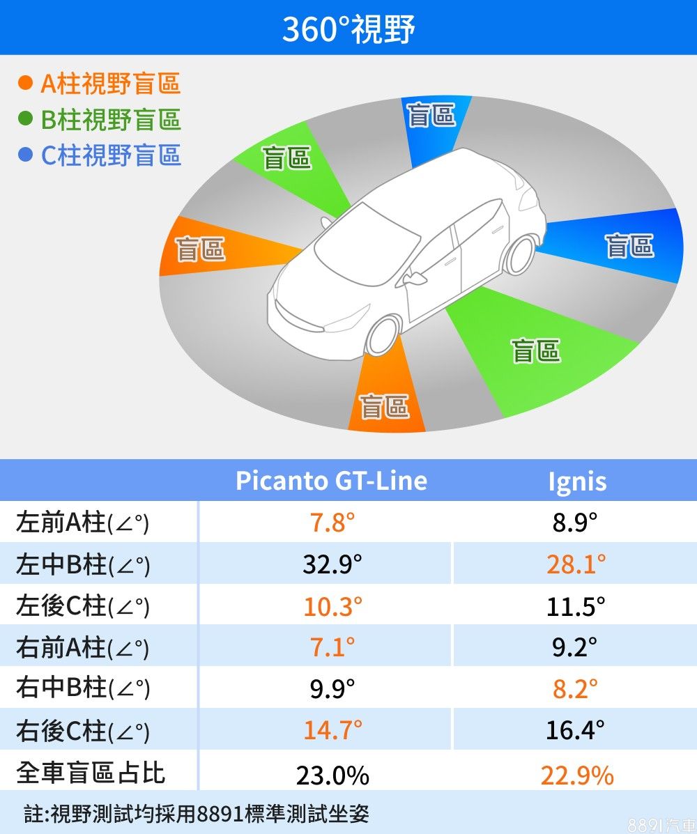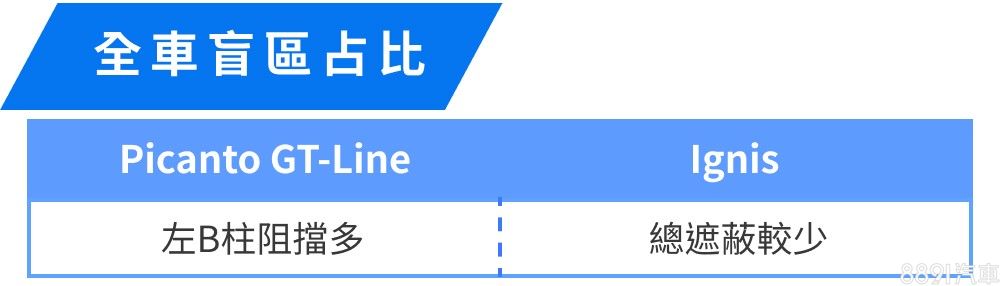 兩車窗戶比例都算大片,但各自仍有較明顯的盲區,Picanto部分是B柱較為厚實,左右盲區多於對手,Ignis則是C柱粗壯、遮蔽較多,總結下來兩車總遮蔽率相仿,Ignis少0.1%險勝。