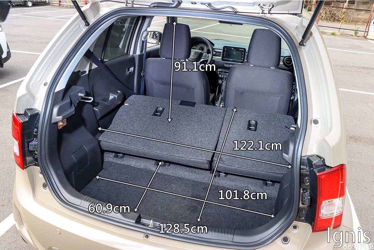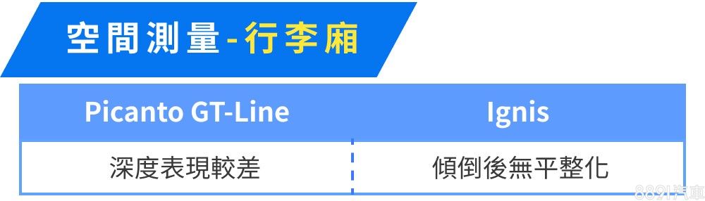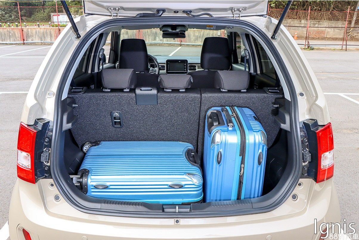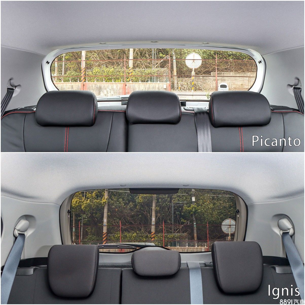 在後座傾倒狀態下,兩者置物空間各有優劣,Picanto有平整化設計,寬度也略好一些,放置大型物品較為便利;Ignis則是高度、深度佔優勢,在座椅未倒狀態下更有餘裕。