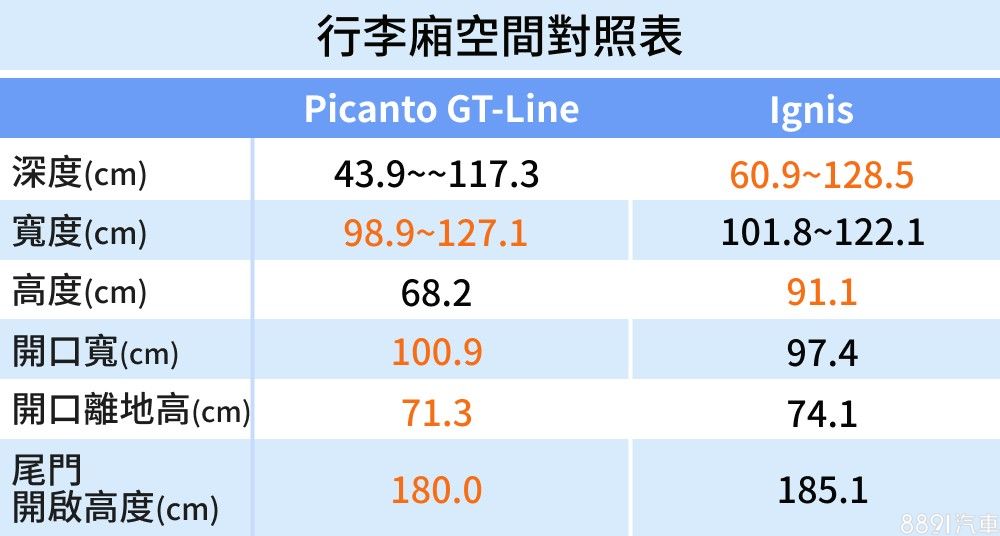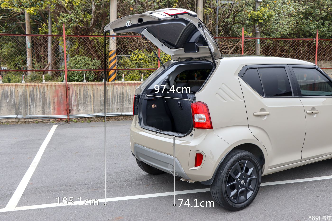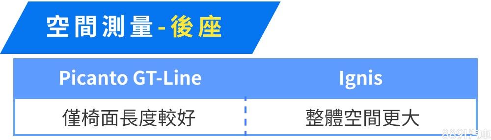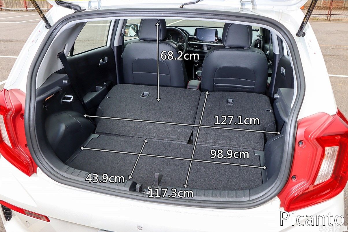 在後座傾倒狀態下,兩者置物空間各有優劣,Picanto有平整化設計,寬度也略好一些,放置大型物品較為便利;Ignis則是高度、深度佔優勢,在座椅未倒狀態下更有餘裕。