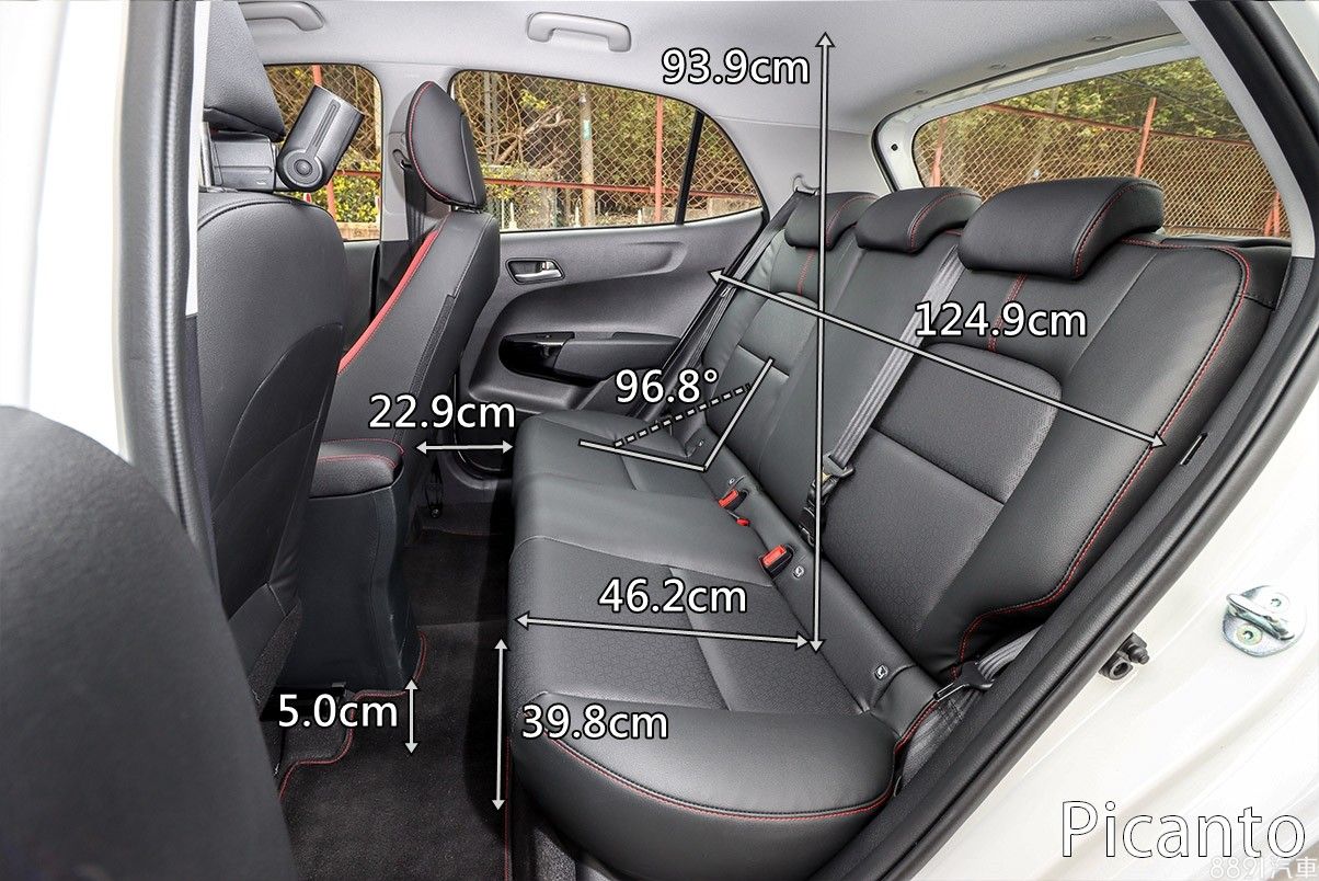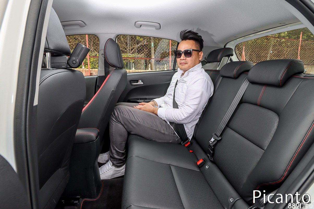Picanto後座缺點很明顯,就是膝部空間太小,小鍾入座膝蓋已經頂到前座椅背了,所幸比對手長又傾斜的椅面,讓大腿獲得良好支撐,舒適性不至於太差。