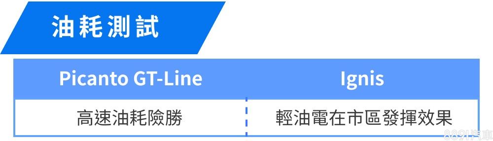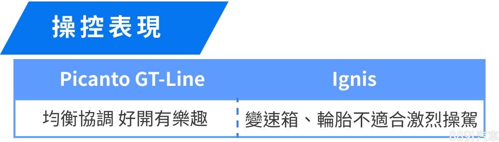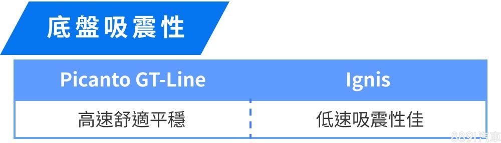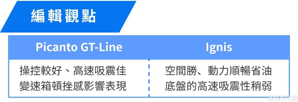 Ignis採用常見的CVT無段變速,加上12V微油電的幫助下,不但動力反應比對手順暢許多、加速實測更快,市區油耗也大幅勝出,契合都會小車代步需求的基本條件,並因為較對手略大的車身尺碼,空間雖然稱不上闊綽,卻比Picanto實用不少,至於底盤部分,Ignis就顯得比較弱勢,應付激烈操駕相對辛苦,高速下的彈跳感也多一些,在操控性和吸震方面的舒適度會沒有Picanto來得均衡。