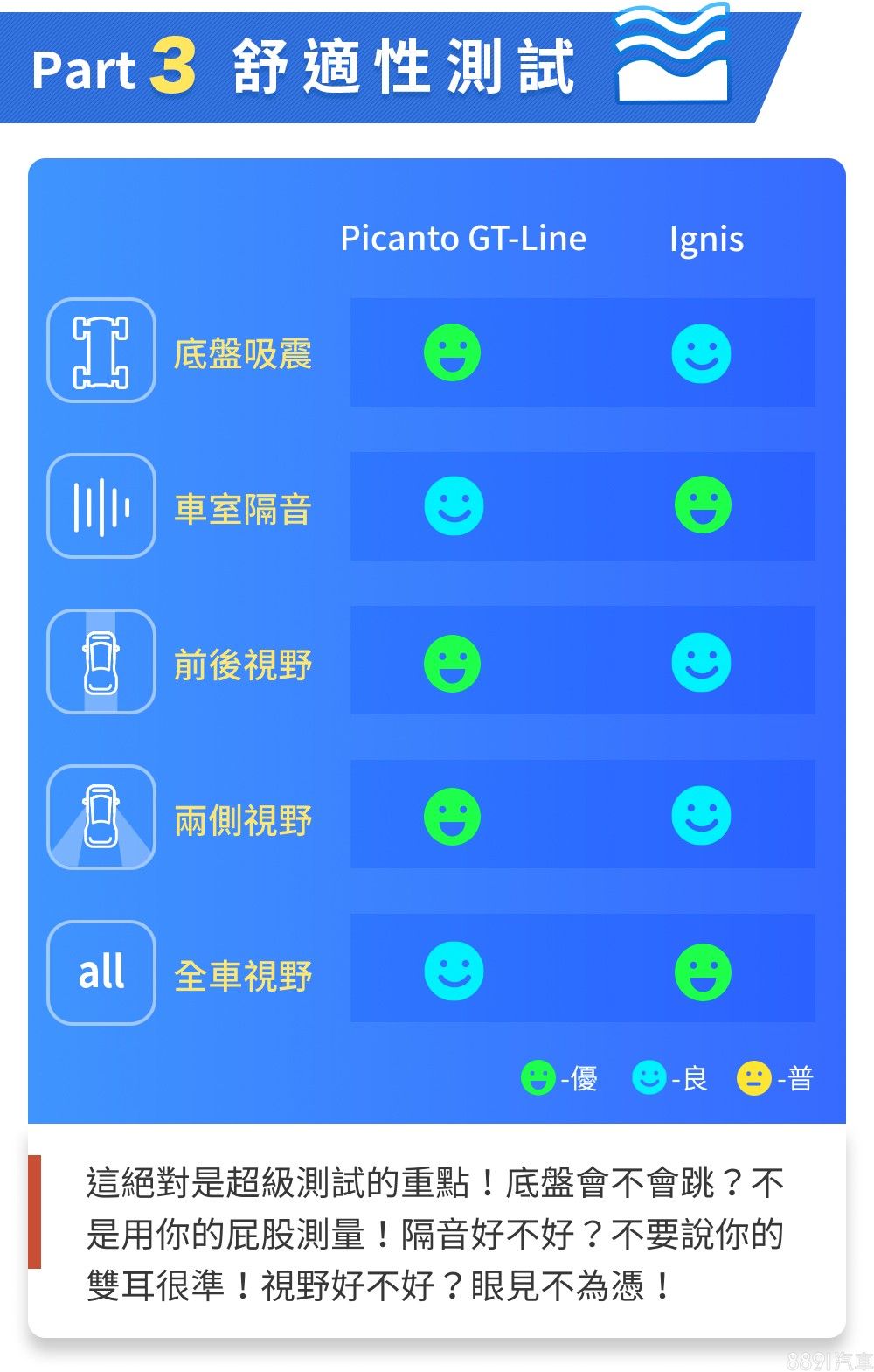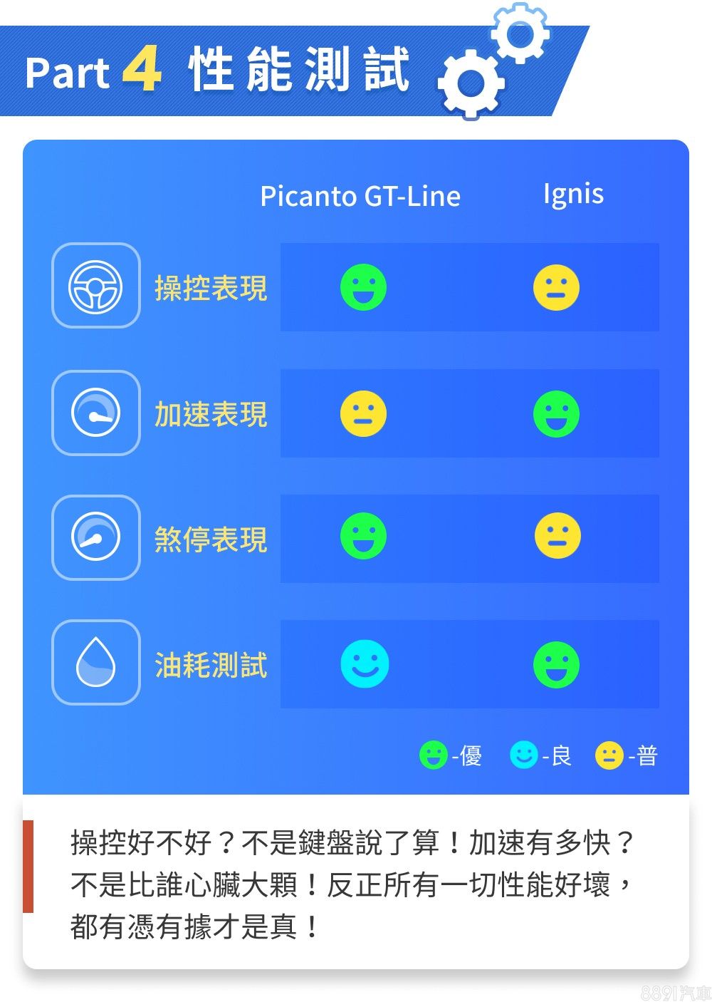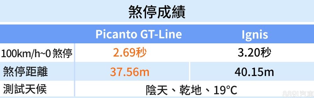 比起Ignis,Picanto GT-Line在動力輸出相仿,車重還多了約100kg的情況下,不論是駕馭感或實測成績,操控性都明顯優於對手,並能繳出更好的高速吸震性,底盤的整體表現勝出!另外要提的重點是Picanto的變速箱,5速單離合自手排設計想必不是人人都能接受,換檔空窗期較久,要稍微配合油門收放的動作才能緩解頓挫現象,影響表現也影響感受,要上手至順暢程度,對駕駛新手來說會有不小的挑戰性。