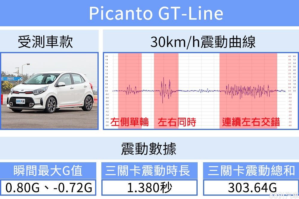 Picanto配胎扁平比較低,避震器設定偏向運動化,在低速通過陣仗時衝擊感較為明顯,震動時長、總和也高於對手。