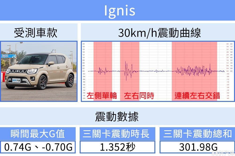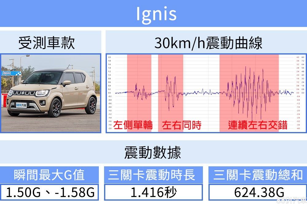 底盤調性偏舒適的Ignis,在60km/h行經左右交錯關卡時,曲線可以看出晃動幅度比對手明顯許多,且擺幅還有加大趨勢,使得震動時長、最大G值表現皆不理想,震動總和當然也高。