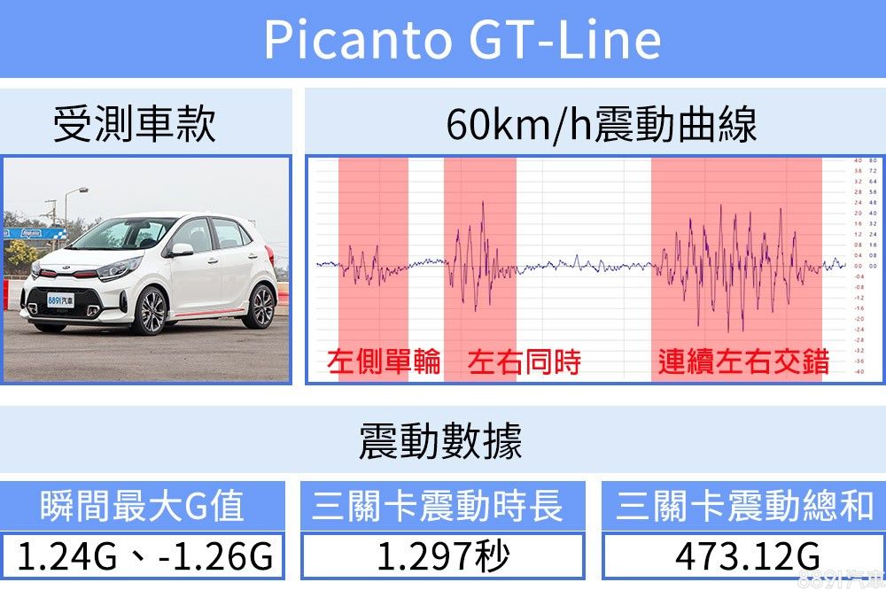 運動化底盤設定,雖然讓Picanto在60km/h的震盪G值較高,但懸吊反應快速,因此震動時長比低速還短,體感確實也較穩定。