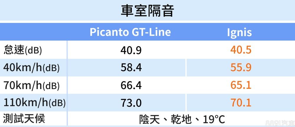 以都會小車的角度來看,兩車底盤噪音表現合宜,風切聲也在接受範圍,Picanto在變速箱五檔齒比偏高,讓時速110km/h巡航時轉速突破3000rpm,而Ignis的CVT變速箱在同樣時速條件下,巡航轉速不過2000rpm出頭,有較寧靜的運轉品質。