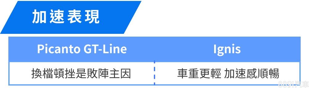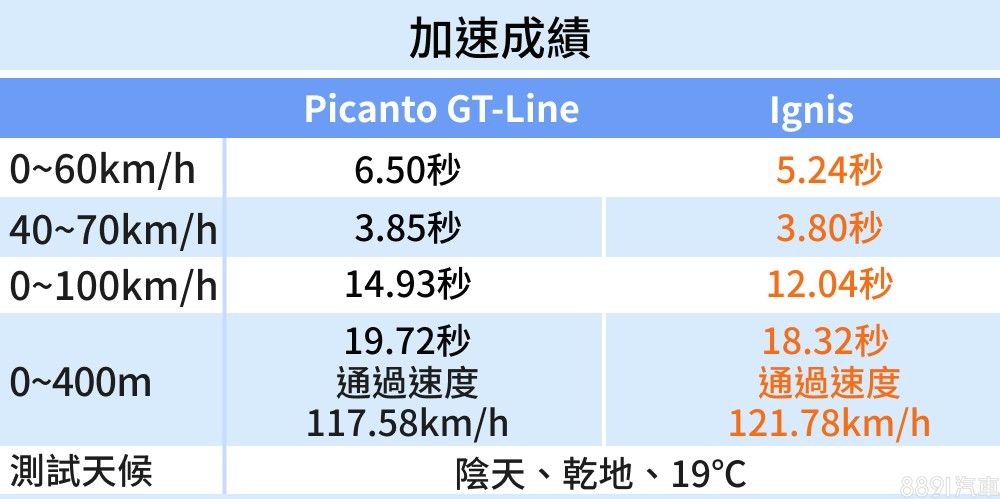 Picanto加速成績是從頭輸到尾,主因是上述的起步狀況,換檔頓挫造成秒數流失;Ignis加速看起來優異,但小缺點是再加速時齒比變化不夠迅速,動力釋放循序漸進,讓40~70km/h再加速表現僅有險勝對手的表現。