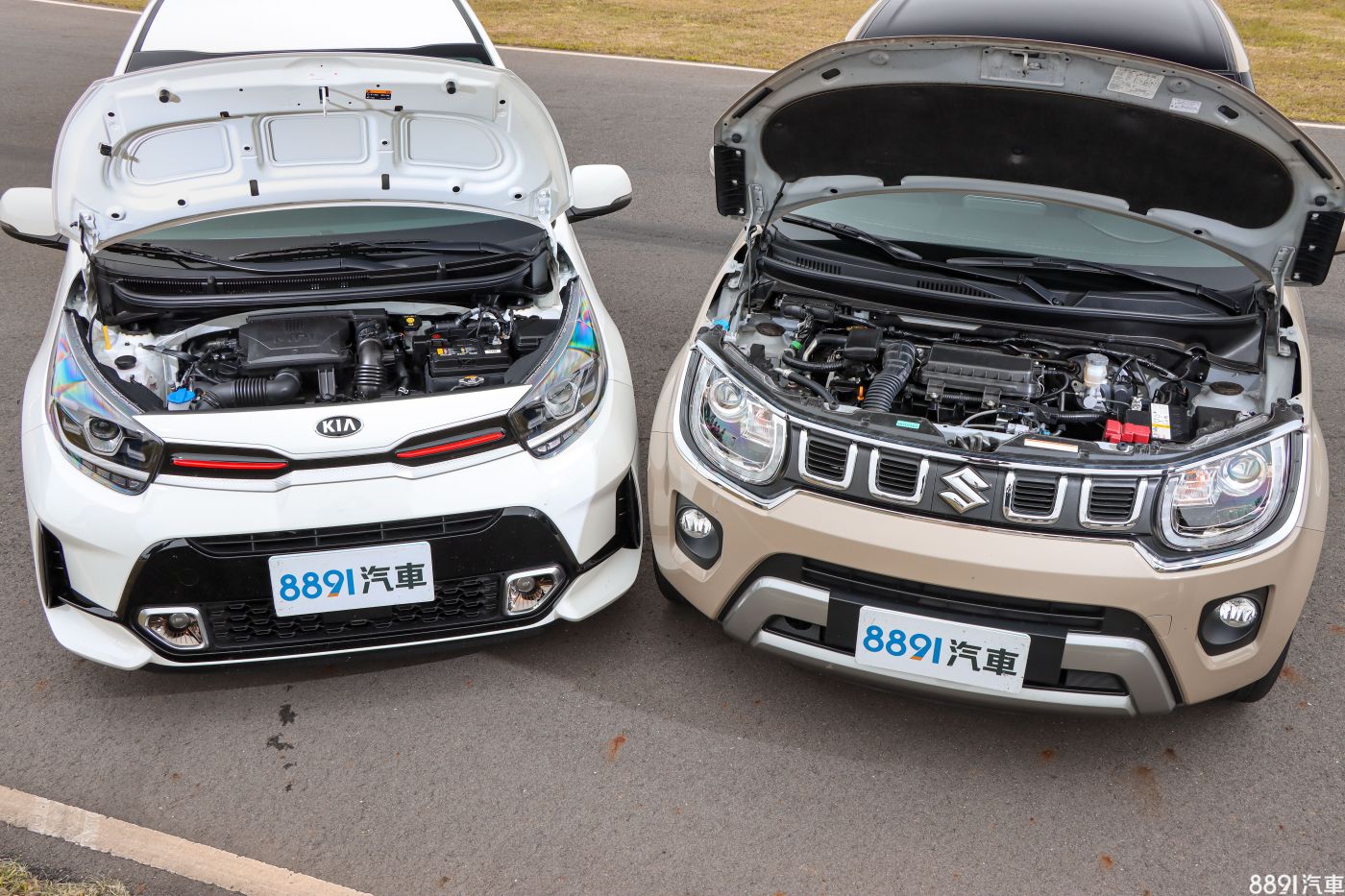小改款Ignis加入輕油電系統,新的1.2升引擎出力為83hp/11kgm,ISG馬達額外供應2.6hp/3.6kgm助力,並搭配CVT變速箱,訴求節能表現。Picanto引擎排量與對手相同,84hp/12kgm最大動力也差不多,重點在於配上一具5速單離合自手排變速箱,主打高傳輸效率,兩者實際開起來動力調性差很多。