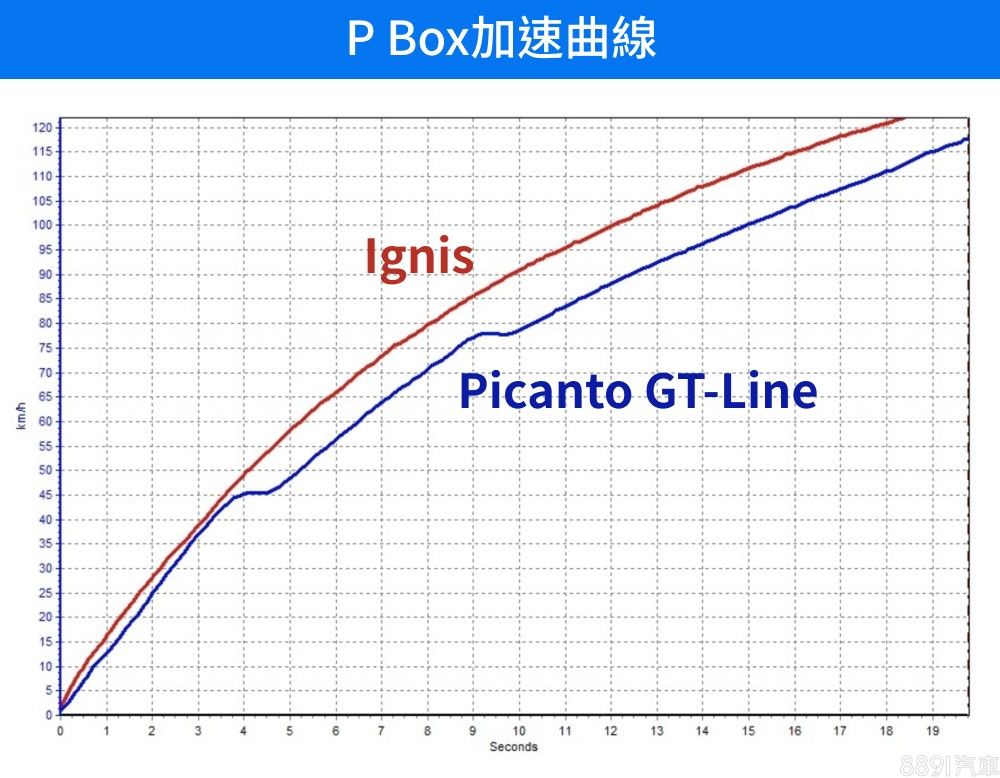 將兩車P Box加速曲線重疊,可以清楚看出,Picanto GT-Line一起步就落後,無法原地拉轉速起跑造成直接影響,隨著單離合器變速箱每換一次檔,都有明顯的速度停頓,而CVT的Ingis就一路持續向前衝,領先幅度逐漸拉大。