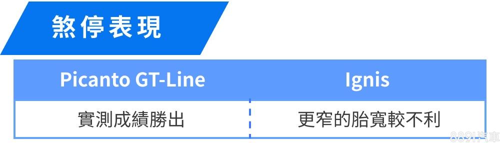 Ignis胎面寬度比對手來的窄,配置有利於降低滾動阻力,符合節能小車定位,但接地面積也更少,讓煞車性能打折,煞停距離實測比對手遠了2.59m。