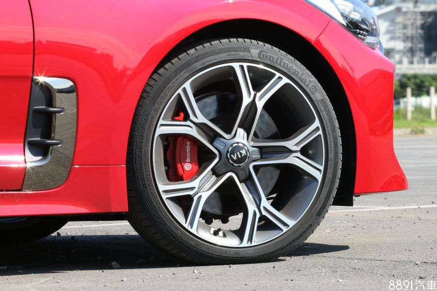 Stinger GT採19吋鋁圈搭配前225/40R19、後255/35R19的馬牌CSC5性能胎,尺碼與等級都夠水準,順帶一提,Stinger兩款等級的圈胎尺碼一樣,但造型不同,高規還有前四、後二活塞的Brembo剎車組,碟盤尺碼也更大。