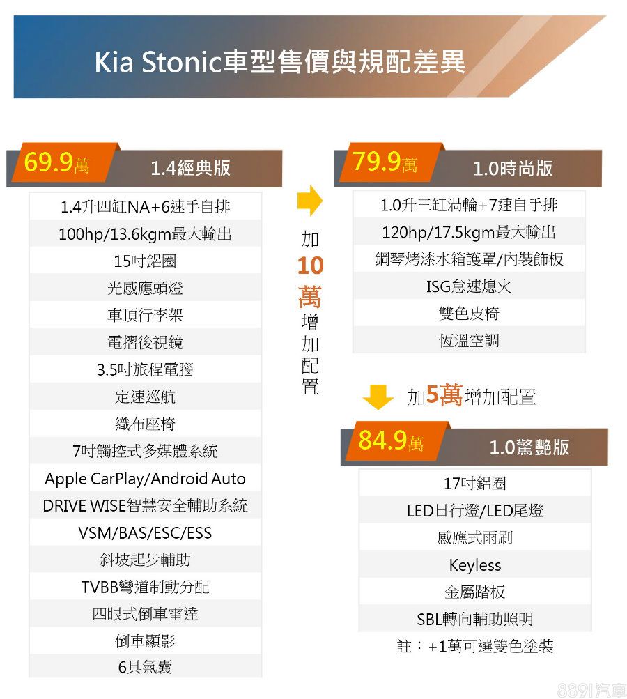 在休旅風潮帶動下,各種大小級距車型百花齊放,其中小型跨界(CUV)級距便是兵家必爭新戰區,銷量最多的便屬Nissan Kicks,小改款Honda HR-V也有穩定的銷售表現,百萬價格帶內CUV可說是競品眾多,且各有強項!稍晚來到的Kia Stonic則推出1.4、1.0T兩種動力、三種配備等級,價格帶為69.9~84.9萬元,且全車系標配DRIVE WISE安全系統,舉凡FCA主動煞停、車道偏移輔助、後方警示、盲點偵測等皆包含其中,不僅以國產價殺入市場,配備豐富度也夠,這次kia真端出牛肉應戰了!
