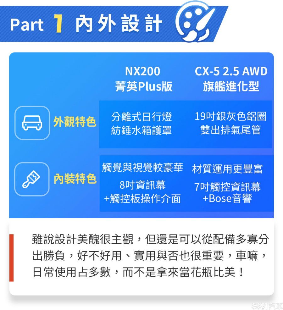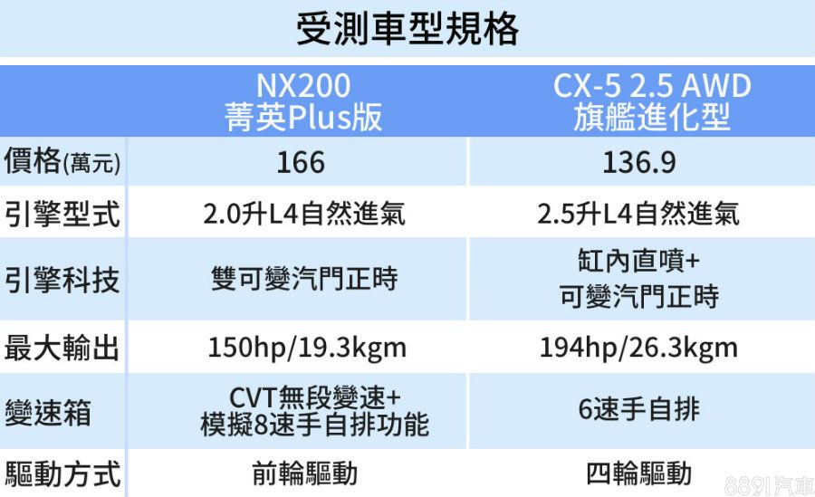 兩車價格大概差了30萬元,論動力數據,CX-5比NX200大了一截,並採用四輪驅動配置,雖然NX200本身就不是強調動力的車型,可以預想到動態會有明顯的表現差異。