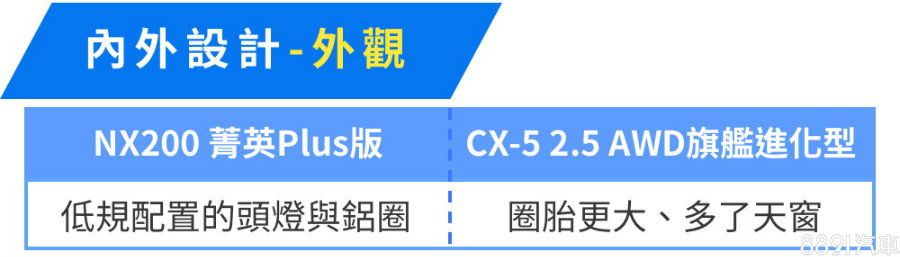 NX200共有菁英、菁英Plus、豪華三種版本,雖然配備不同,但外觀差異甚小,豪華版僅多出18吋鋁圈。本次試駕NX200有換裝外觀套件,因此前後保桿非原廠式樣,但也不影響車款特點,紡錘型水箱護罩、分離式日行燈設計,讓看起來比CX-5兇悍又具識別性;前後燈組採全LED規格,可惜之處為頭燈僅有AHB主動遠近光切換,科技性不若CX-5的智慧光型變化高。