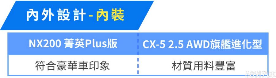 相較於NX200,CX-5的中控軟質塑料比較多一些,但藉由頂規豐富的材質鋪陳,木紋飾板、類金屬飾條等應用下,讓CX-5聞得出「準豪華」車的味道。以設計來說,CX-5中控台、排檔座都較為低陷,讓年輕跑格氛圍下,不失座艙開闊感。