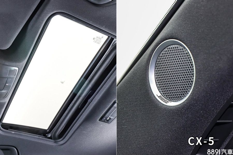 CX-5頂規較NX200多出天窗,對於黑色頂棚車室,有助於採光表現,讓空間感近一步提升,10支Bose音響聽起來也比NX200更有臨場感,整體來說雖視覺、觸覺豪華感不及NX,但配備給得更齊!