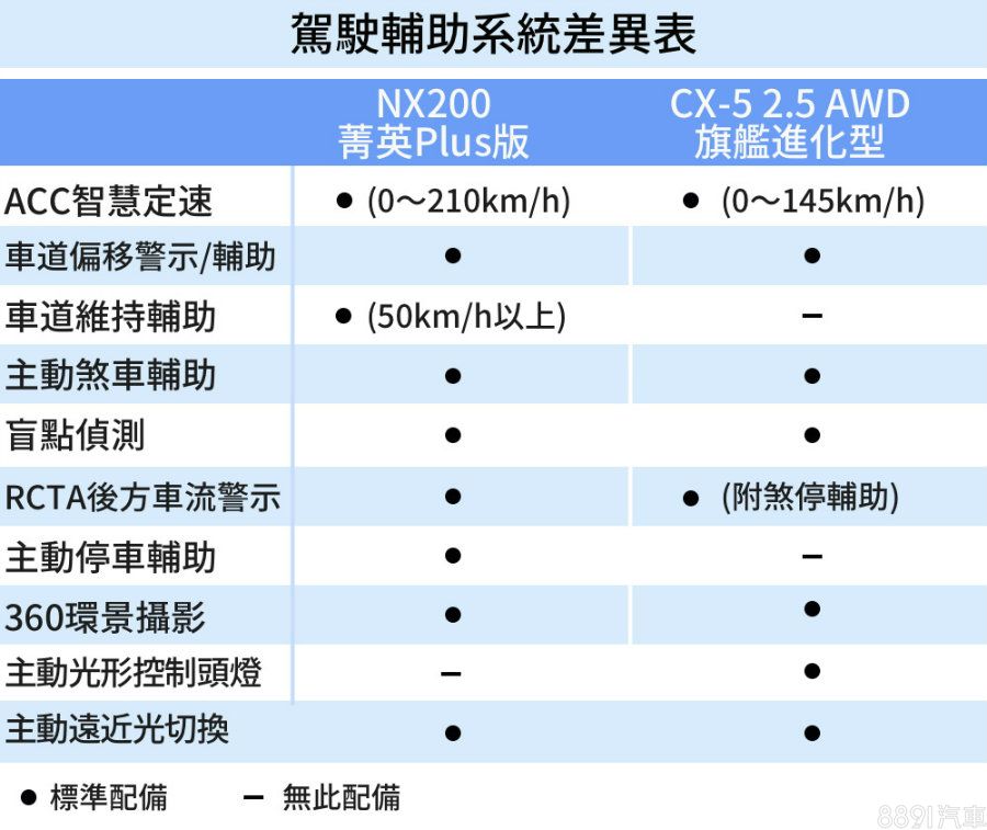 CX-5雖然螢幕僅有7吋,畫質好、操作更直覺,也附有觸控功能,10支Bose音響也夠誠意,至於Apple CarPlay/Android Auto則是兩車都有,兩車娛樂系統便利性都不差,但論豐富度,CX-5略勝一籌。至於通風座椅功能,在潮濕炎熱的夏天肯定比加熱實用,座椅三段風量可直接從雙區恆溫空調介面調整。CX-5配置全速域MRCC,不過0~145km/h範圍較小,也僅有車道偏移輔助功能,讓NX200在主動安全配備上扳回一城。