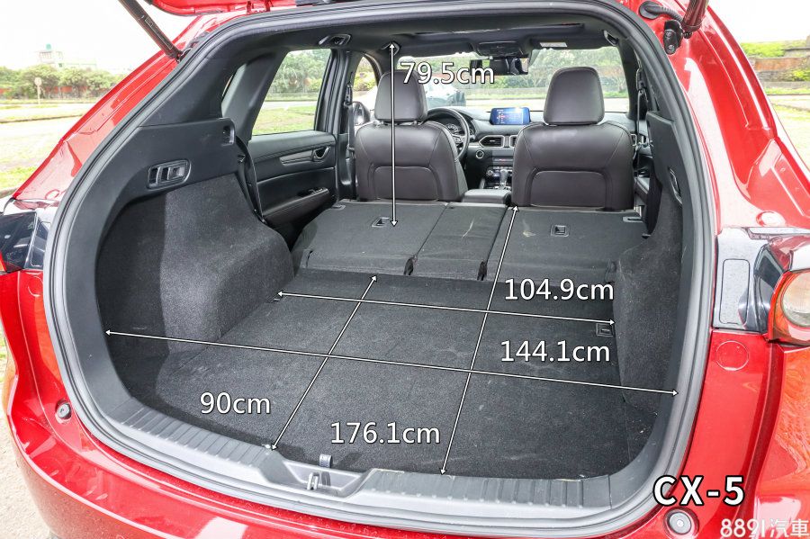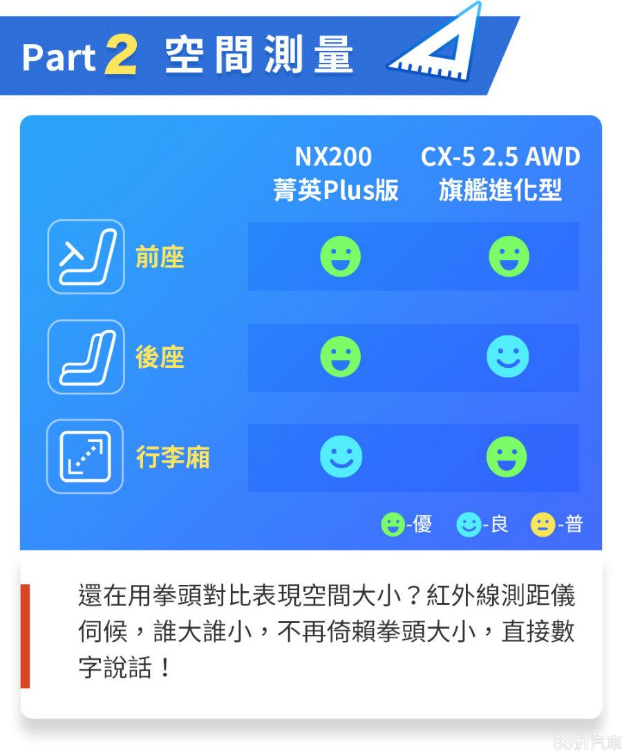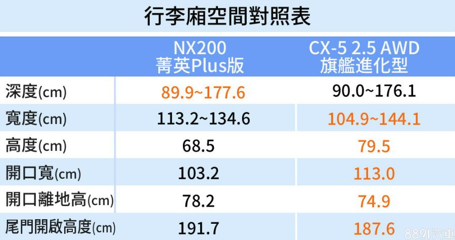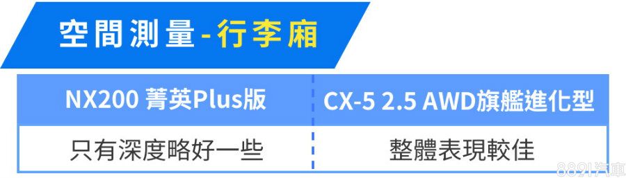 CX-5在高度與最寬處表現都優於NX200,不過兩側輪拱體積較大,橫向最窄的數據就不如NX200,另外是後座傾倒狀態的平整度也稍弱一些。
