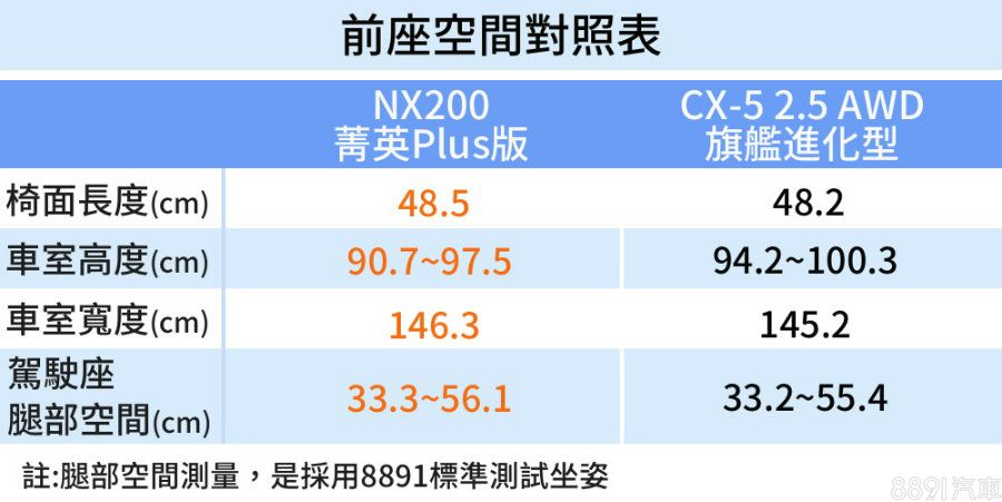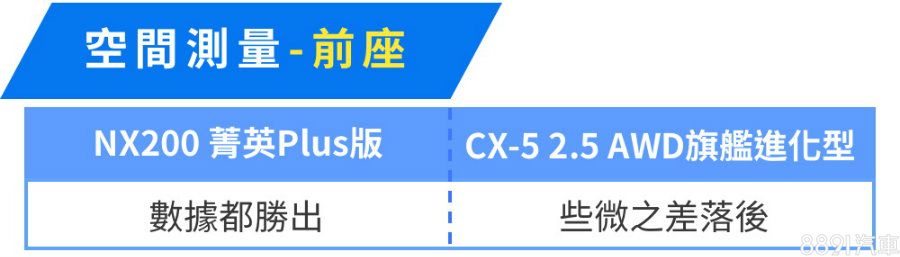 NX200在數據上都以微小幅度勝過CX-5,不過實際上,NX200的中控台相對高聳,中央鞍座造型也比較寬,CX-5給予前座乘客的開闊性更好。